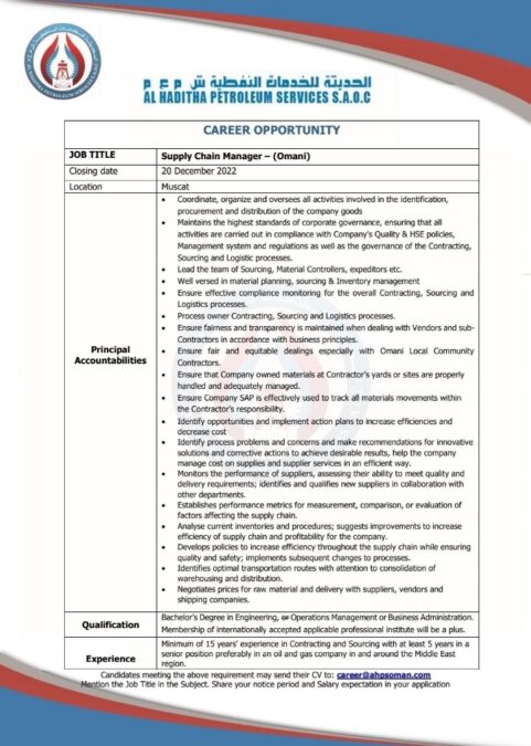 أعلنت الشركة الحديثة للخدمات النفطية في سلطنة عمان عن توفر فرص وظيفية شاغرة برواتب مجزية في هذه الوظائف التالية يفكغك بحسب ما تم تداوله على وسائل الإعلام :