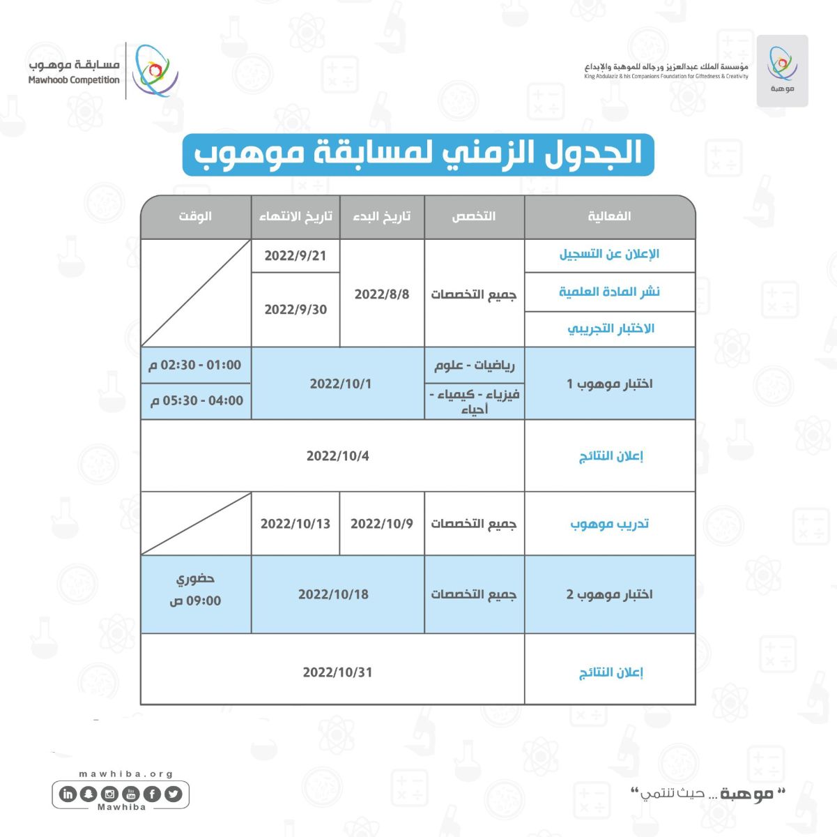 الجهات المختصة اعلنت أن موعد التسجيل في موهبة لعام 1444هـ – 2022م، قد بدأت منذ 08/ أغسطس/ 2022م، على أن يتم إعلان النتائج النهائية في تاريخ 31/ اكتوبر/2022م، وتوضح الصورة التالية الجدول الزمني المخطط له ضمن مسابقة موهوب لعام 2022م: