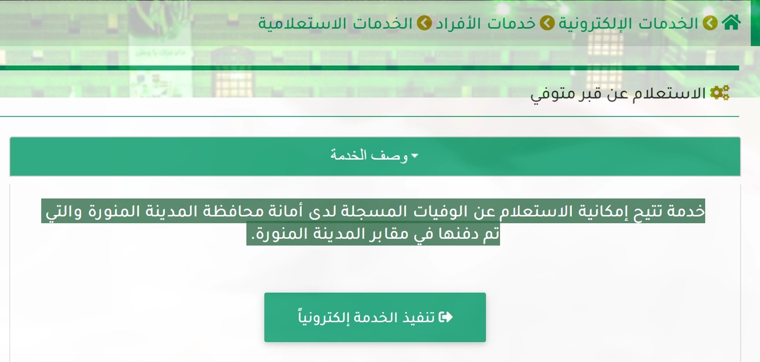 والجدير بالإشارة إلى أن خدمة الاستعلام عن مكان جثمان متوفي متاحة بشكل إلكتروني بطريقتين، الأولى منهما عن طريق الدخول إلى منصة بلدي عبر بوابة النفاذ الوطني الموحد، في حين تتم الطريقة الثانية من خلال الدخول إلى أمانة المدينة في حال معرفة المدينة التي دفن فيها المتوفي.