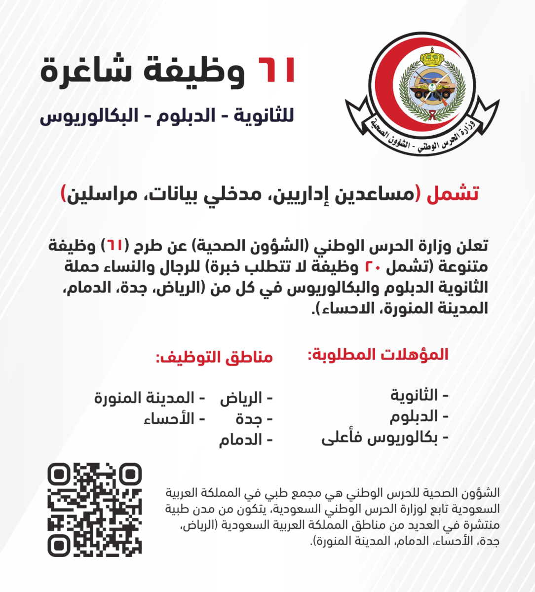 إدارة الشؤون الصحية بوزارة الحرس الوطني في السعودية أعلنت عن توافر عدد 61 فرصة توظيف شاغرة منها عدد 20 وظيفة لاتحتاج إلى خبرة سواءا للرجال أو النساء من حملة مؤهل الثانوية والدبلوم والبكالوريوس فما فوق وبرواتب كبيرة وغير مسبوقة وذلك في المدن التالية .