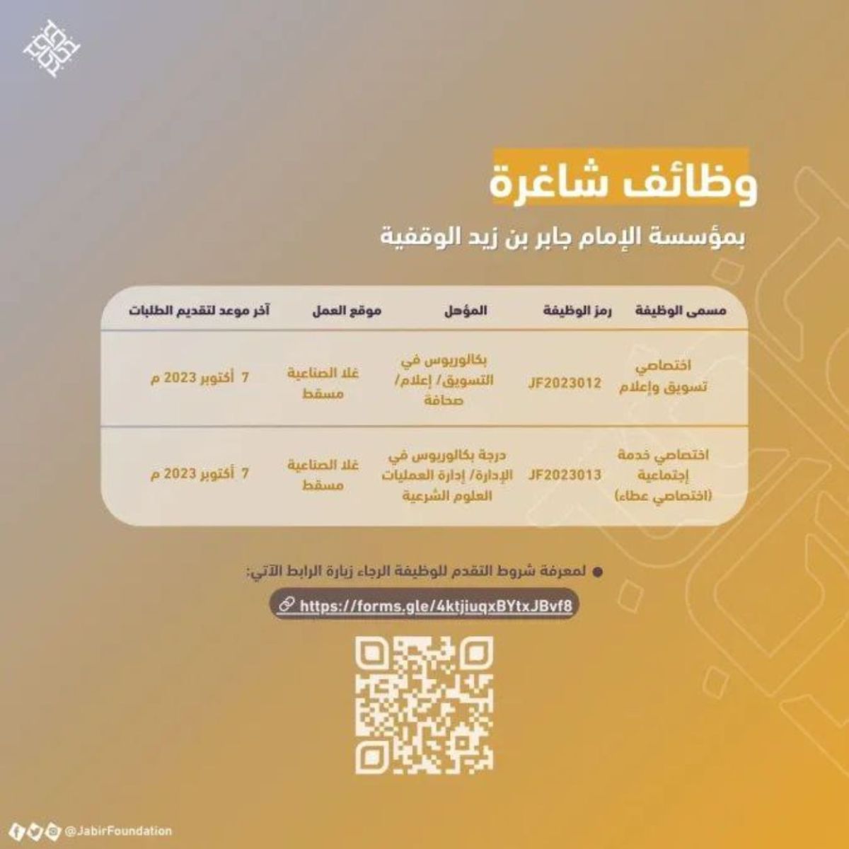 فرص عمل شاغرة اعلنت عنها مؤسسة الإمام جابر بن زيد الوقفية في عمان تشمل مايلي كدزبق بحسب ما تم تداوله على وسائل الإعلام :