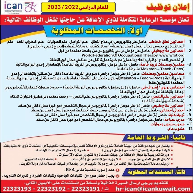 أعلنت مؤسسة الرعاية المتكاملة لذوي الإعاقة في الكويت، عن توفر فرص وظيفية شاغرة لديها في مجموعة كبيرة من التخصصات للمواطنين ولمختلف الجنسيات، وفي هذه السطور سوف نعرض لكم المسميات الوظيفية مع مؤهلات حددتها المؤسسة للراغبين في التقديم لهذه الوظائف .