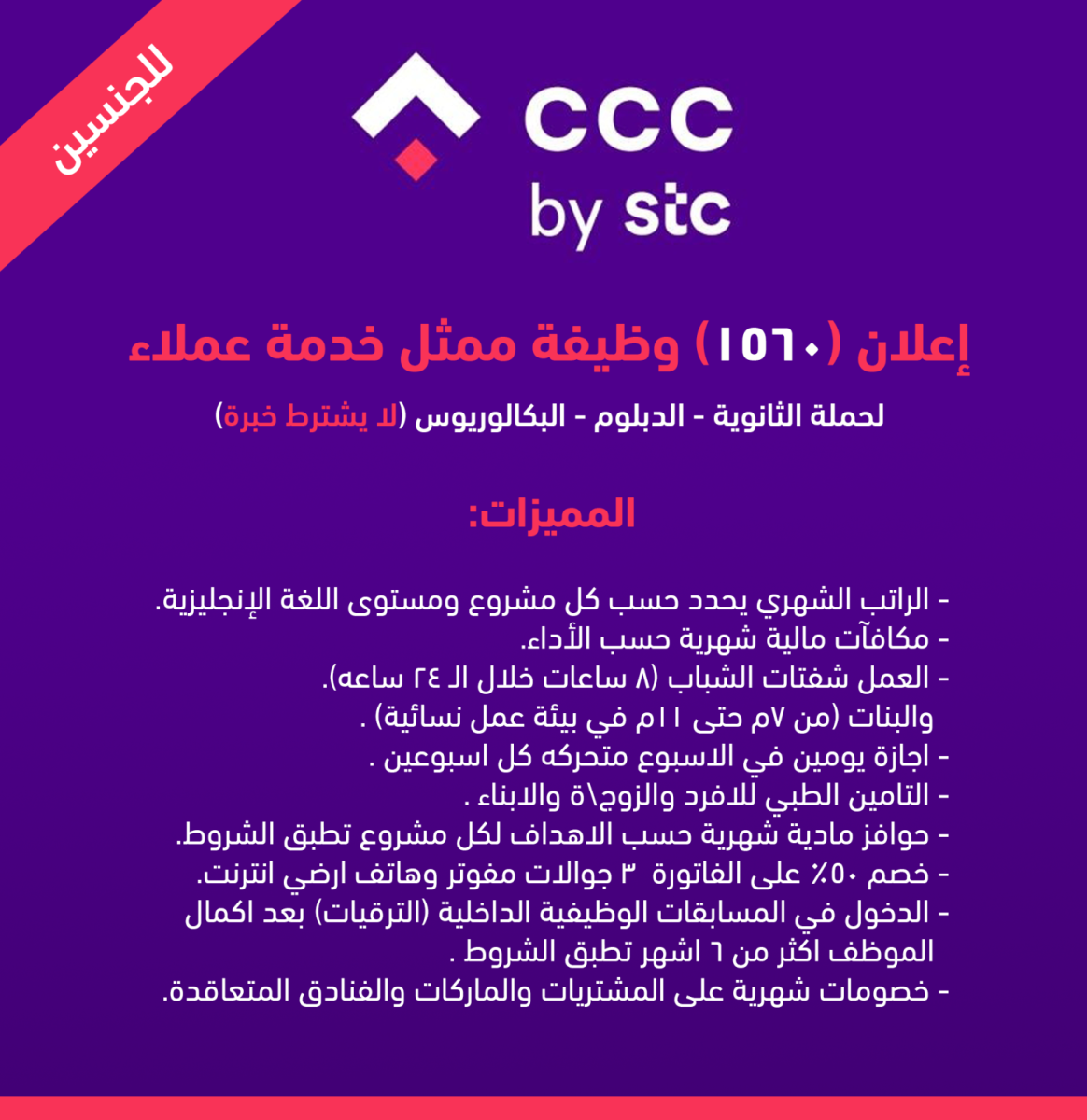 شركة مراكز الإتصال الرائدة في المملكة العربية السعودية التابعة لشركات الاتصالات السعودية "STC" اعلنت عن توافر عدد 1560 فرصة توظيف شاغرة للراغبين بالعمل براتب يصل إلى 6000 ريال سعودي وحوافز ضخمة وتأمين شامل ووفق شروط ومؤهلات سوف نوافيكم بها في سطور هذه المقالة .