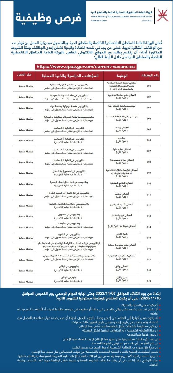بالتنسيق مع وزارة العمل بسلطنة عمان أعلنت الهيئة العامة للمناطق الاقتصادية الخاصة والمناطق الحرة عن توفر عدد من فرص التوظيف الشاغرة لديها للرجال والنساء في عدد من التخصصات والمؤهلات التي حددتها الهيئة في المسميات الوظيفية التالية .