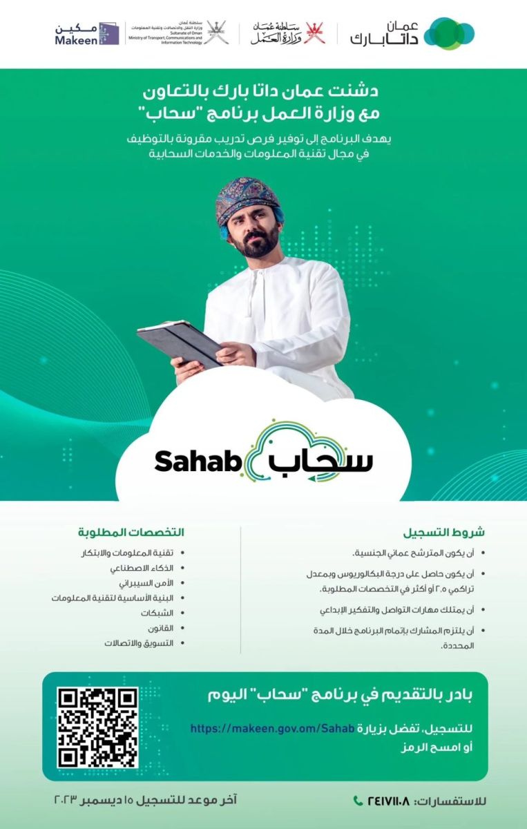 قامت وزارة النقل والاتصالات وتقنية المعلومات وشركة عمان داتا بارك بالتعاون مع وزارة العمل في عمان واطلقت اقوى برنامج “سحاب” تدريبي للمواطنين وذلك في عدد من مجالات الحوسبة السحابية وتقنية المعلومات، ووفق شروط سوف نقوم بعرضها لكم في سطور هذه المقالة .