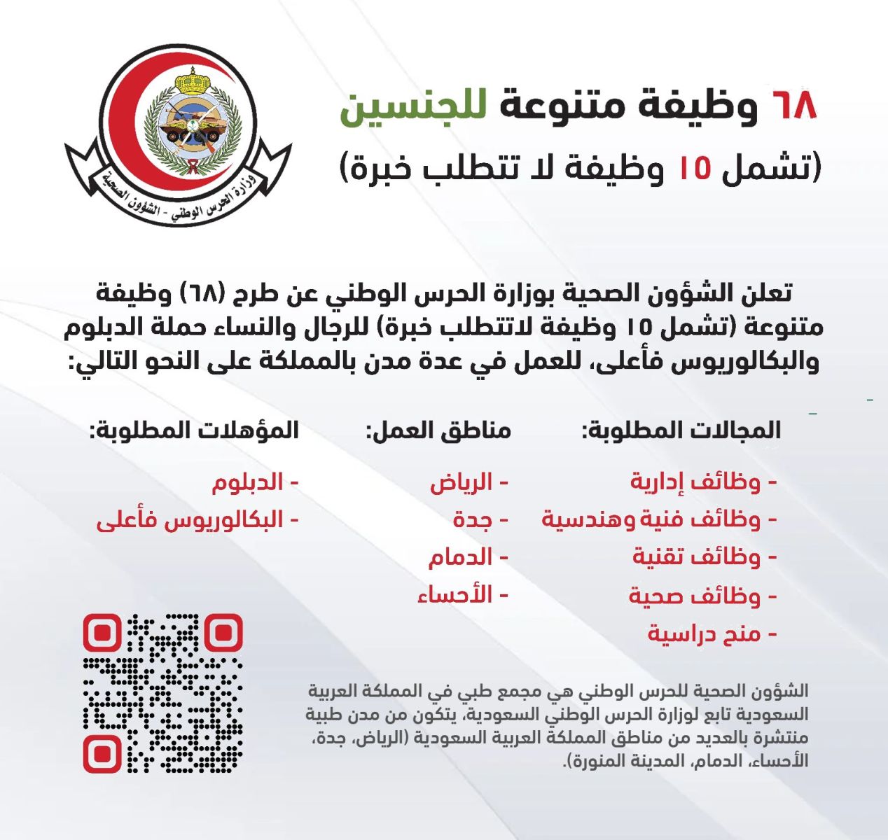 وزارة الحرس الوطني اعلنت عن توفيرها عشرات الوظائف الشاغرة لديها للراغبين في العمل لديها من الرجال والنساء حملة مؤهلات الدبلوم والبكالوريوس فما فوق، حيث تتميز هذه الفرص أنها لا تحتاج إلى خبرة مسبقة ويمكنك معرفة أبرز مسميات الوظائف في الفقرة التالية .
