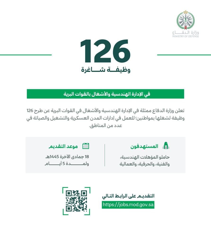 تعلن وزارة الدفاع في المملكة العربية السعودية عن توفر 126 فرصة وظيفية شاغرة في الإدارة الهندسية والأشغال بالقوات البرية للمواطنين فقط من حملة المؤهلات الفنية والحرفية والهندسية والعمالية وسنقدم لكم فيما يلي تفاصيل الوظائف الشاغرة ورابط التقديم .