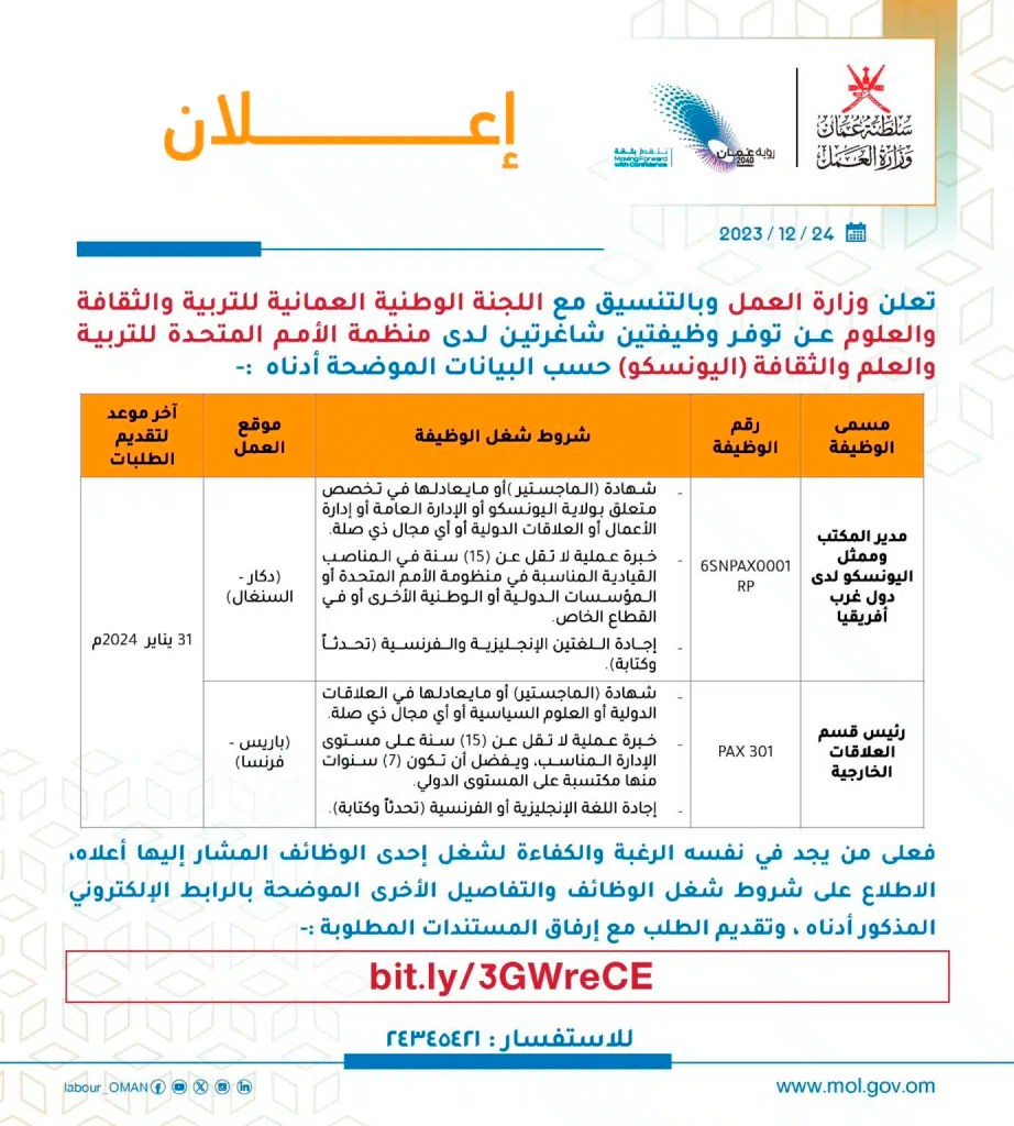 متوفر وظائف شاغرة أعلنت عنها وزارة العمل في سلطنة عمان بالتنسيق مع اللجنة الوطنية العمانية للتربية والثقافة والعلوم وذلك لدى منظمة الأمم المتحدة UNESCO، ووفق عدد من الشروط والمؤهلات التي سنقوم بموافتكم بها في سطور هذه المقالة مع طرح رابط مباشر للتقديم لهذه الشواغر الوظيفية .