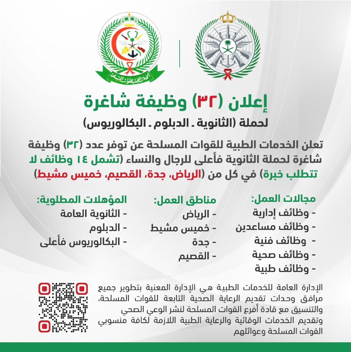 أكثر من 32 فرصة توظيف شاغرة في المملكة العربية السعودية اعلنت عن إدارة الخدمات الطبية للقوات المسلحة وذلك لحملة مؤهلات الثانوية العامة والدبلوم فما فوق وذلك في مدن الرياض، جدة، القصيم، خميس مشيط، علما أنه توجد من هذه الوظائف لا تحتاج إلى خبرة، واليكم ابرز مسمياتها .