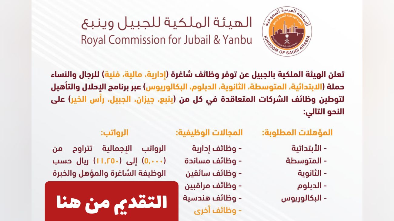 اعلنت الهيئة الملكية في المملكة العربية السعودية عن توفيرها وظائف براتب يتراوح ما بين الـ 5000 و 11,250 ريال سعودي منها فرص لا تتطلب توفر خبرة مسبقة، حيث يمكنك الآن التقديم لوظيفة العمر عبر الرابط المباشر الذي سنضعه لكم اسفل المقال .