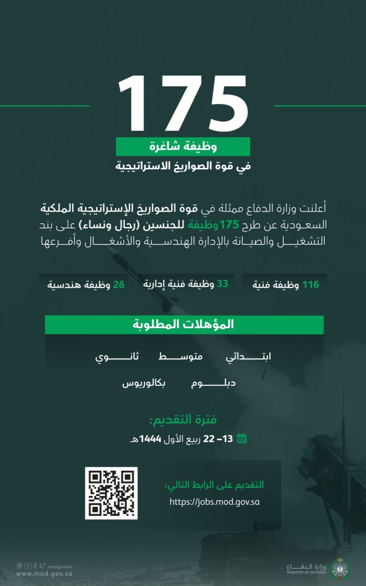 وزارة الدفاع السعودية أعلنت عن توفر عدد من الوظائف الشاغرة بعدد 175 وظيفة شاغرة في قوة الصواريخ الاستراتيجية، حيث اتاحت وزارة الدفاع السعودية هذه الوظائف لجميع الجنسين من الرجال والنساء، حسب عدد من المؤهلات والشروط التي حددتها الوزارة، و هذه الوظائف جاءت على بند التشغيل والإدارة والصيانة والهندسة والأشغال، حيث ان الإعلان هذا جاء في سياق دعم المملكة للجهود التي تهدف إلى تحقيق قوة عسكرية رادعة لأي اعتداء خارجي، إضافة إلى استثمار القوة البشرية ذات الكفاءة والمهارة في خدمة الوطن