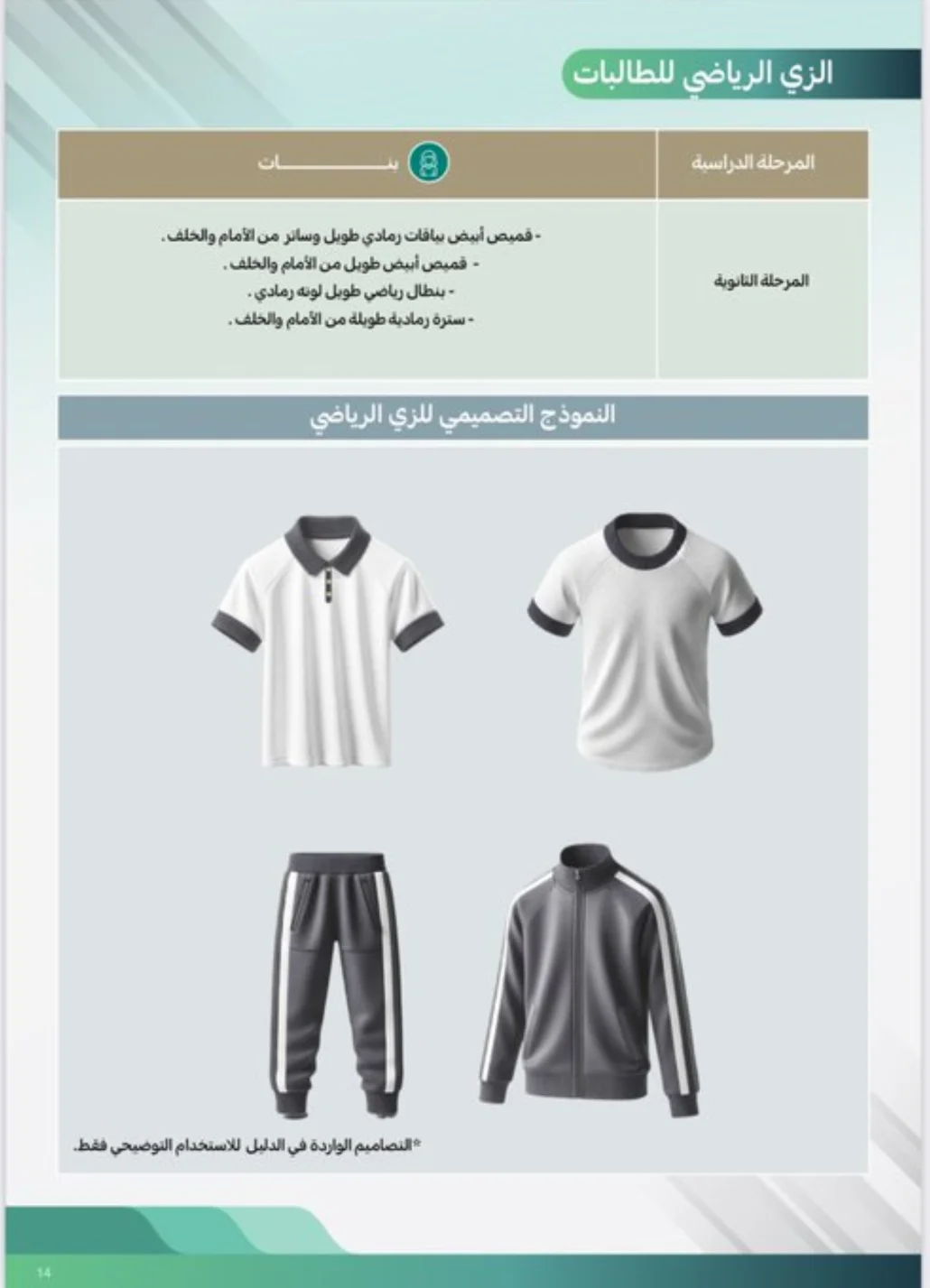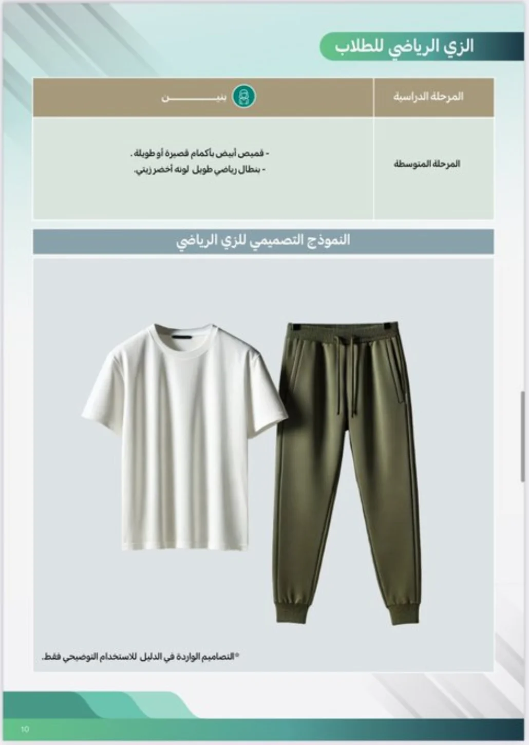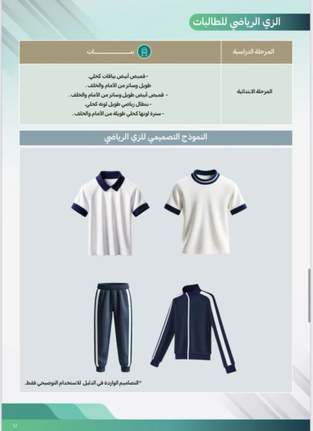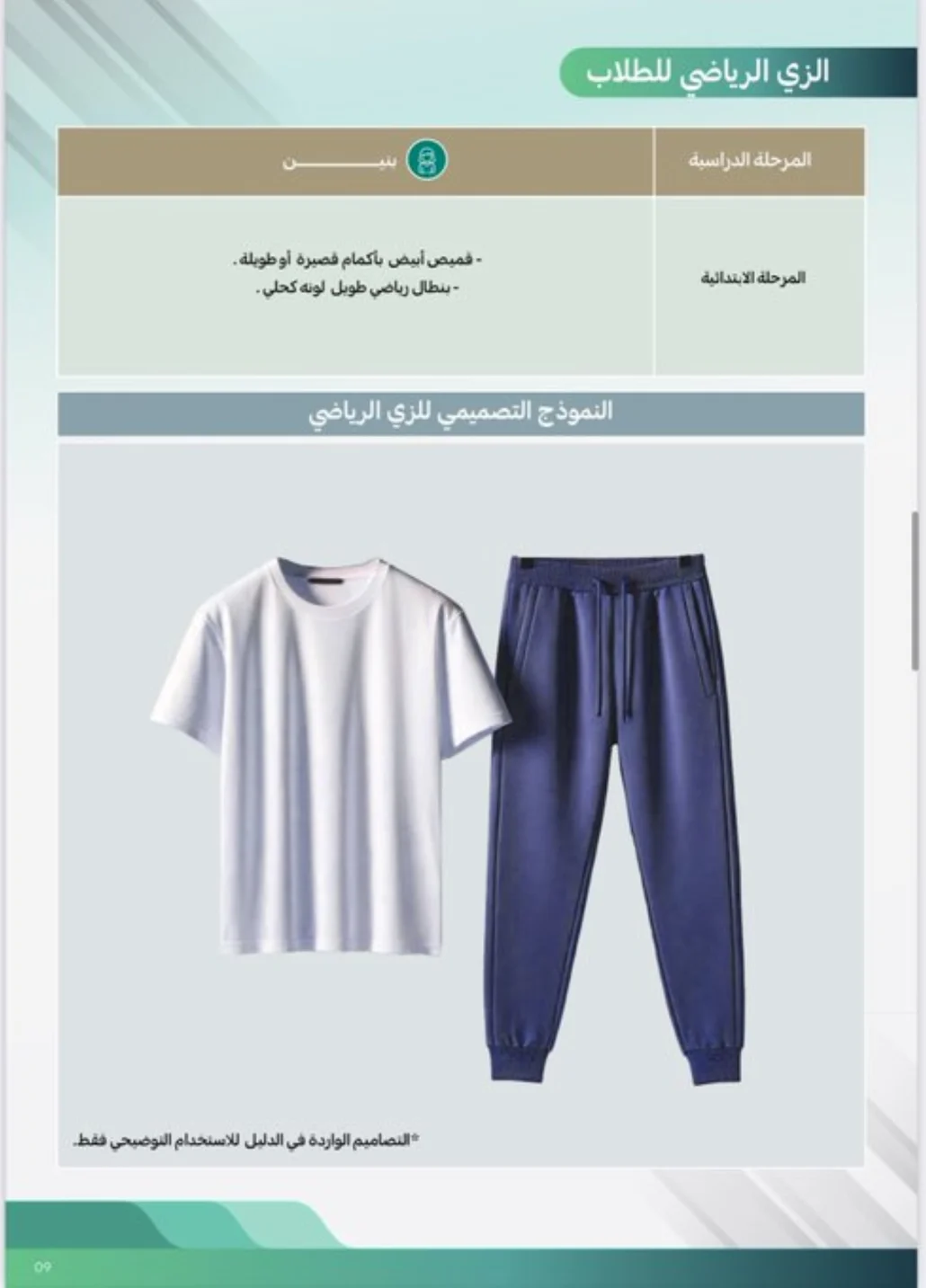 - الابتدائية: قميص أبيض بأكمام قصيرة أو طويلة، وبنطال رياضي كحلي طويل.