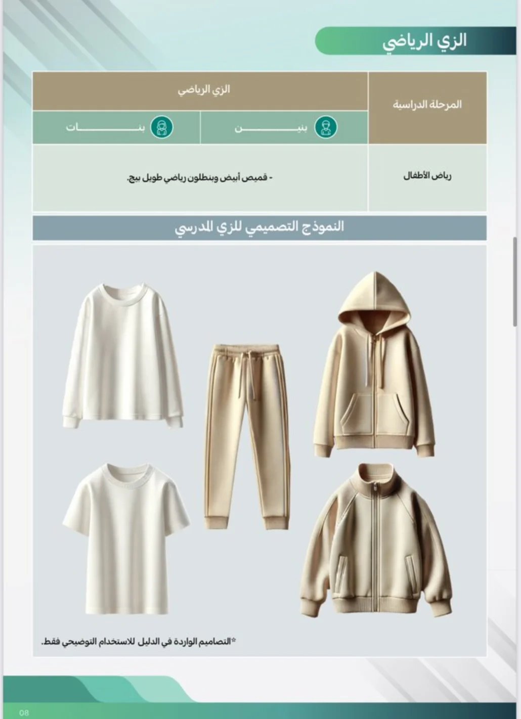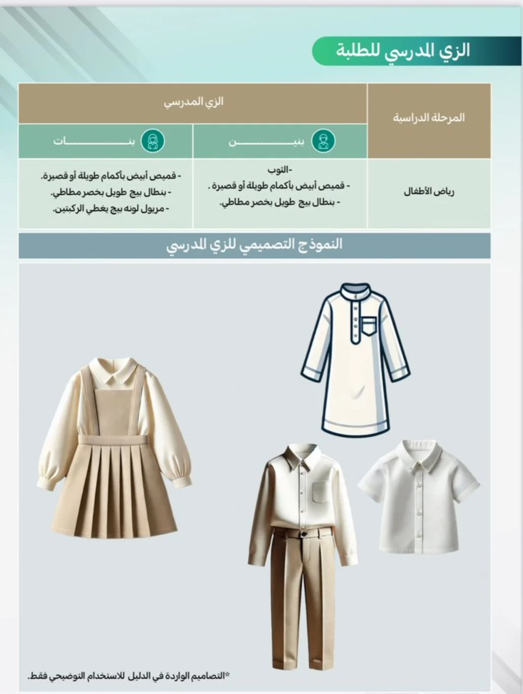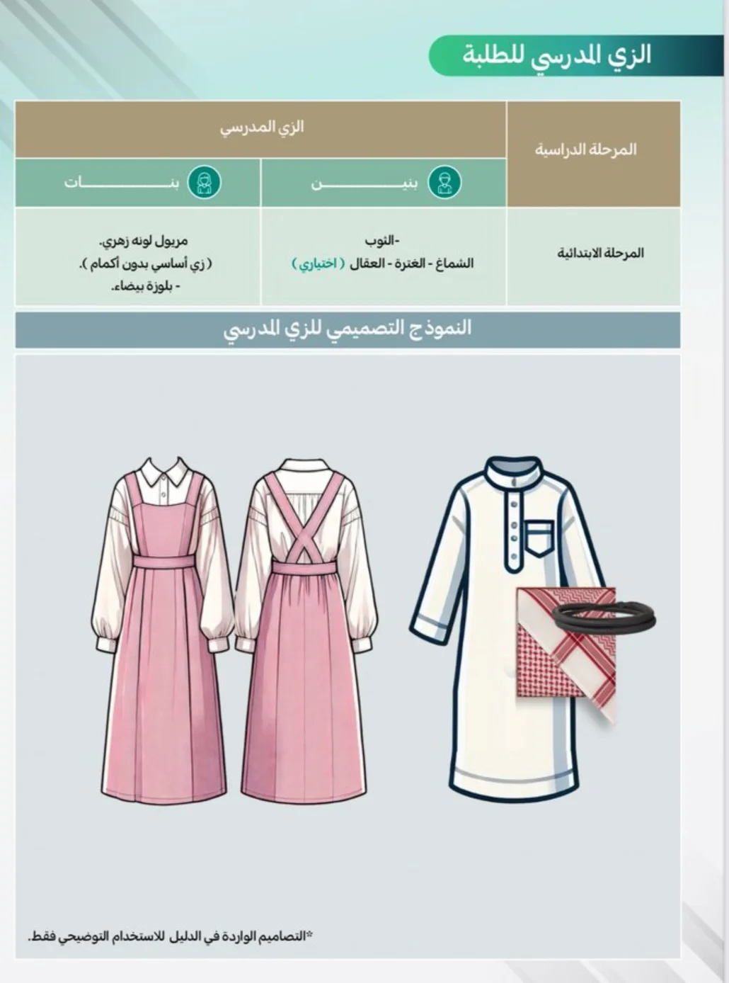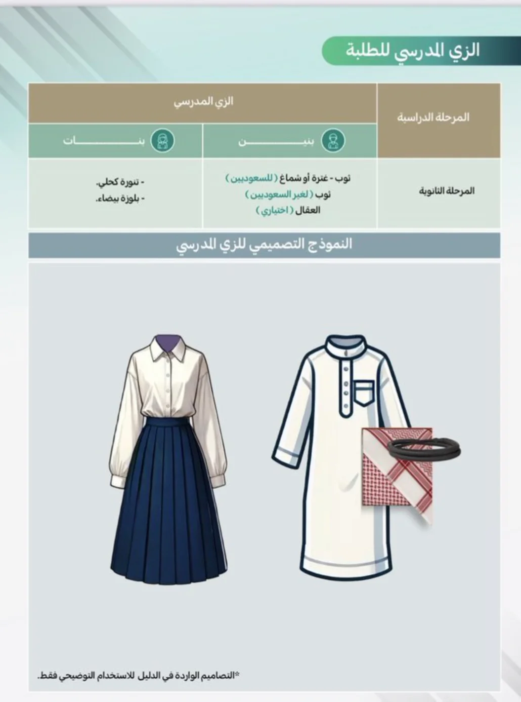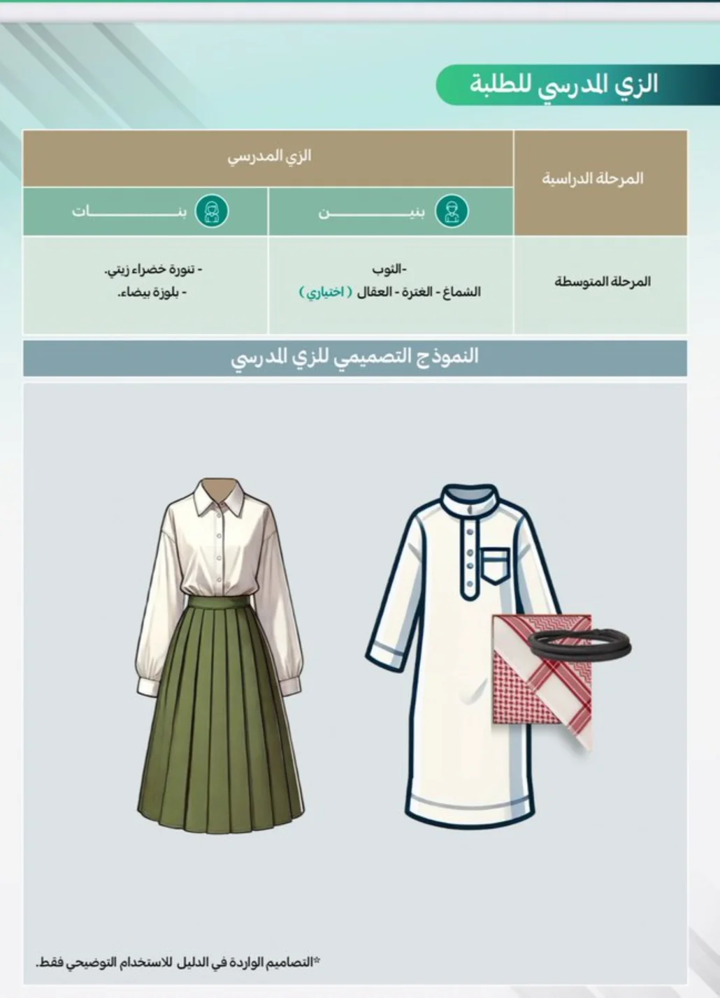 - البنين: زي مشابه للمرحلة الابتدائية (ثوب مع شماغ أو غترة وعقال اختياري).