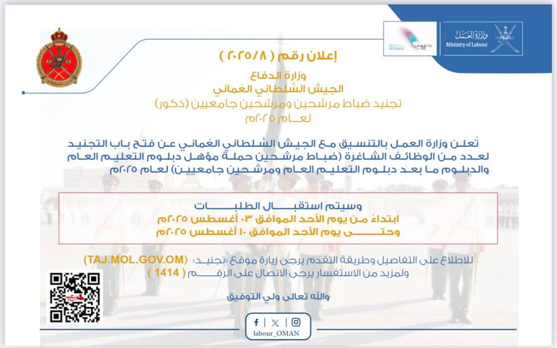 أعلنت وزارة العمل في سلطنة عمان، بالتعاون مع الجيش السلطاني العماني، عن فتح باب التقديم لتجنيد ضباط مرشحين ومرشحين جامعيين (ذكور) للعام 2025، ضمن جهود الدولة لتوفير فرص وظيفية نوعية للمؤهلين من المواطنين، تأتي هذه المبادرة ضمن خطة استراتيجية لتعزيز الكفاءات الوطنية في القطاع العسكري .
