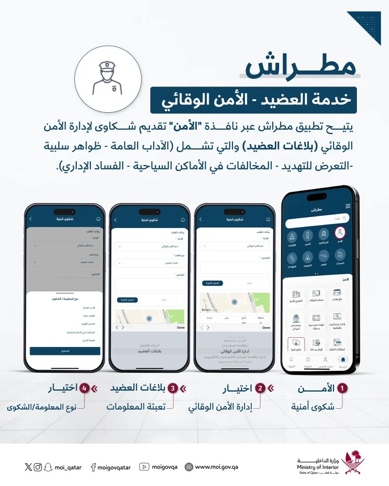 وفرت وزارة الداخلية في قطر آلية سهلة لتقديم البلاغات عبر خدمة العضيد في تطبيق مطراش، وذلك عبر الخطوات التالية: