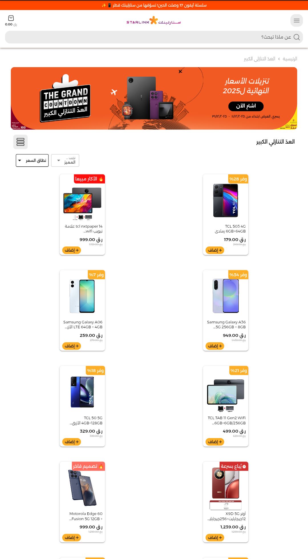 هل تبحث عن أفضل عروض الجوالات في قطر لتجديد هاتفك أو شراء هدية مميزة؟ أعلن متجر ستارلينك (Starlink) عن إطلاق حملة "العد التنازلي الكبير" وتنزيلات الأسعار النهائية لاستقبال عام 2025، والتي تشمل خصومات مذهلة تصل إلى أكثر من 30% على مجموعة واسعة من الهواتف الذكية، الأجهزة اللوحية، والساعات الذكية .