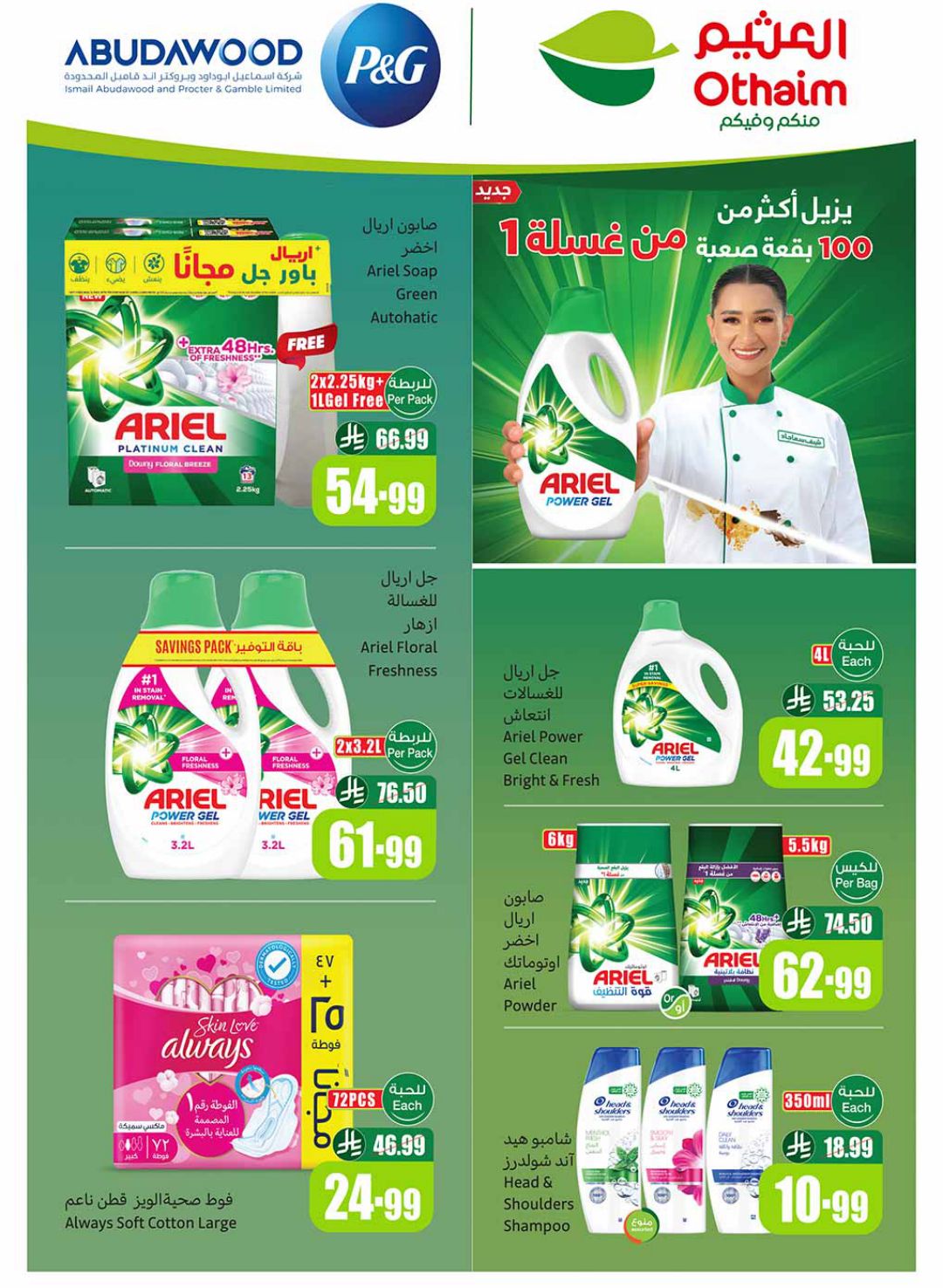 لم تغفل عروض العثيم عن احتياجات النظافة، حيث قدمت باقات توفيرية بالتعاون مع شركات عالمية مثل (Ariel, Tide, Pantene):