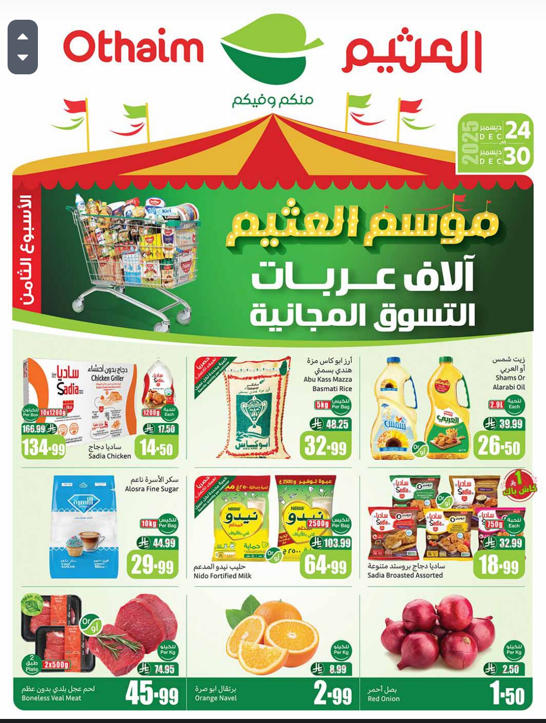 تطبق هذه العروض في جميع فروع العثيم بدءاً من يوم الأربعاء 24 ديسمبر وحتى الثلاثاء 30 ديسمبر 2025، أو حتى نفاد الكمية خظثغب بناء على ما تم الاعلان عنه رسميا من الجهات المختصة .