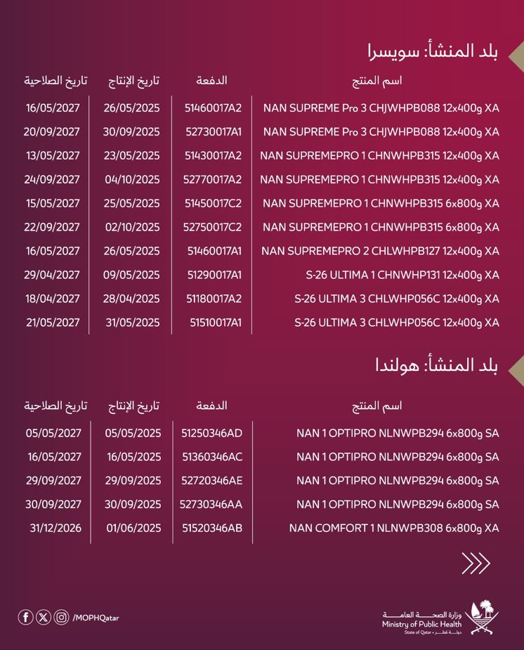 وأوضحت الوزارة أنه حتى الآن لم تُسجل أي حالات إصابة مرتبطة بهذه المنتجات، مشيرة إلى استمرار متابعة التحاليل المخبرية للتأكد من سلامة الحليب، إلى جانب التواصل المستمر مع الشركة المصنعة. كما أكدت الوزارة أنها ستعلن عن أي تحديثات فور توفرها بشأن هذه الدفعات.