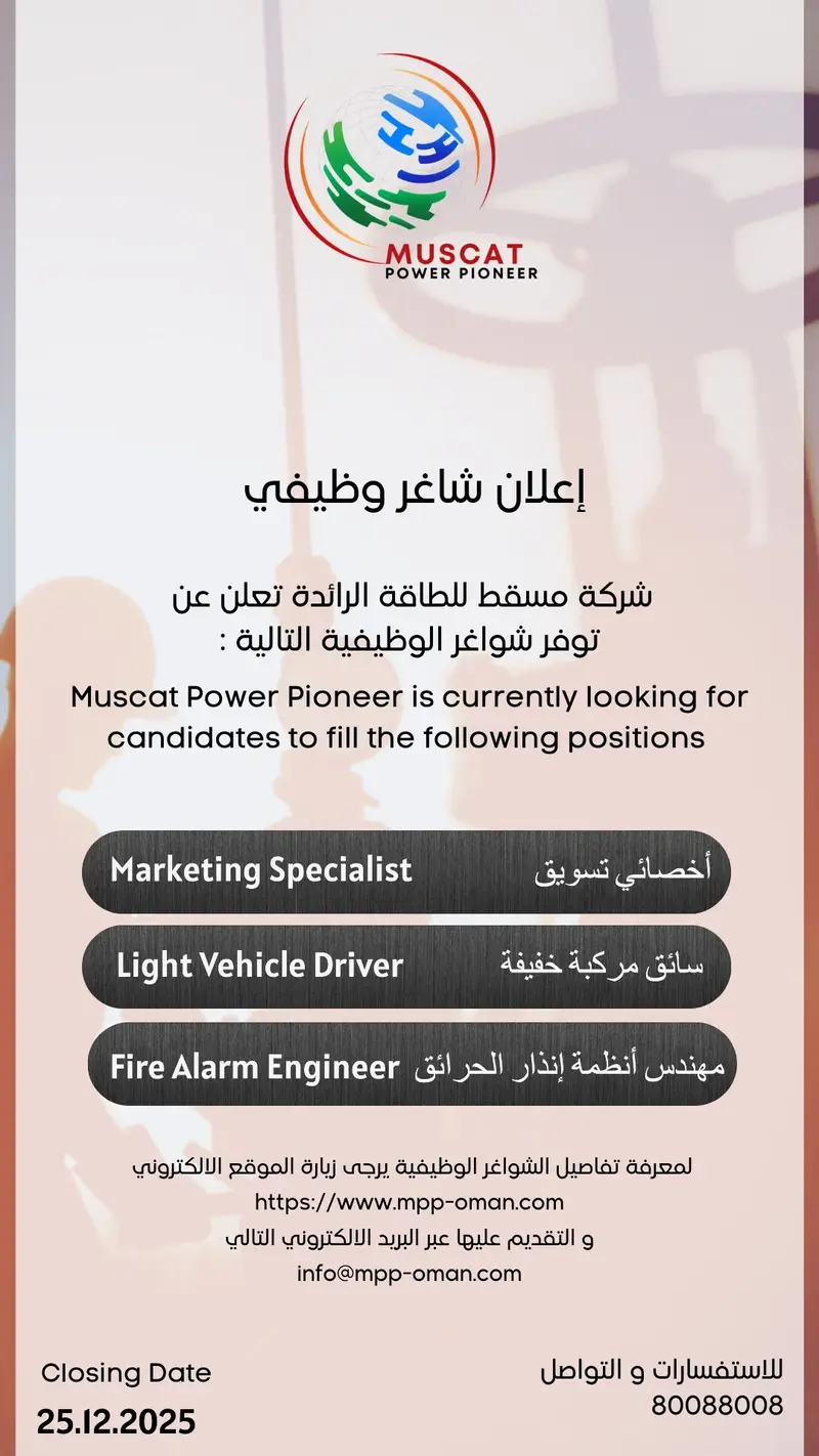 أعلنت شركة مسقط للطاقة، إحدى الشركات الرائدة في مجال الطاقة بسلطنة عمان، عن فتح باب التوظيف للعديد من التخصصات المهمة لعام 2026 . هذه الفرص موجهة للباحثين عن عمل الراغبين في الانضمام إلى بيئة عمل احترافية ومتميزة.