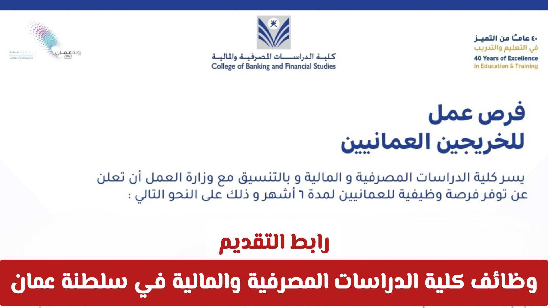 أعلنت كلية الدراسات المصرفية والمالية في سلطنة عمان، بالتعاون مع وزارة العمل العُمانية، عن طرح مجموعة من فرص العمل المؤقتة للخريجين العُمانيين بعقود تمتد لمدة ستة أشهر، وذلك في إطار دعم التوظيف الوطني وتوفير خبرات عملية مهنية في قطاعات متعددة داخل الكلية .