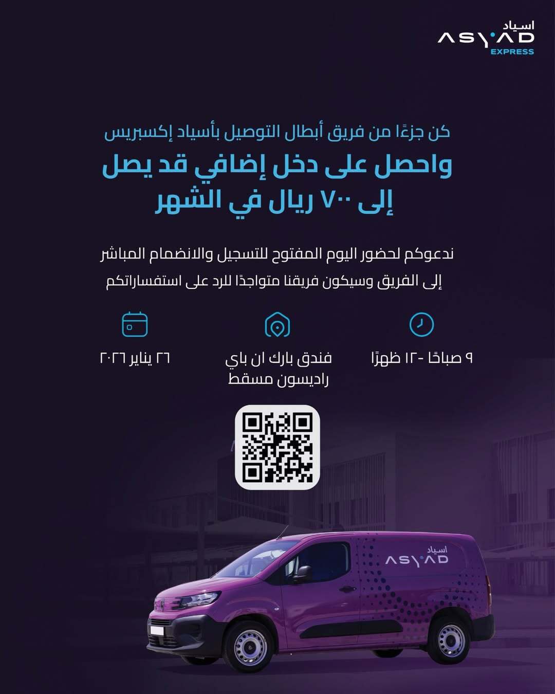 أطلقت "أسياد إكسبريس" حملة توظيف تستهدف العمانيين الباحثين عن وظائف في سلطنة عمان تتميز بالمرونة. العرض المغري هنا هو إمكانية الحصول على دخل إضافي قد يصل إلى 700 ريال عماني شهرياً.
