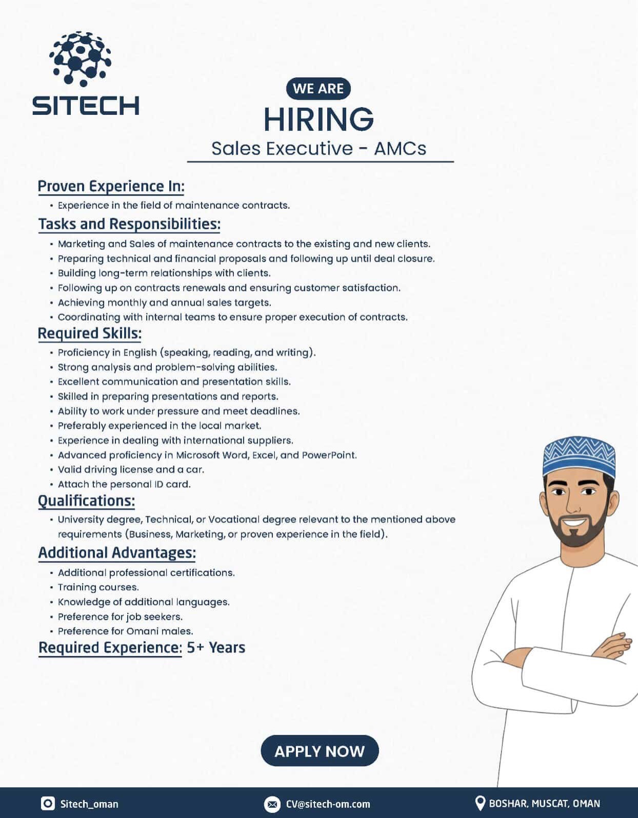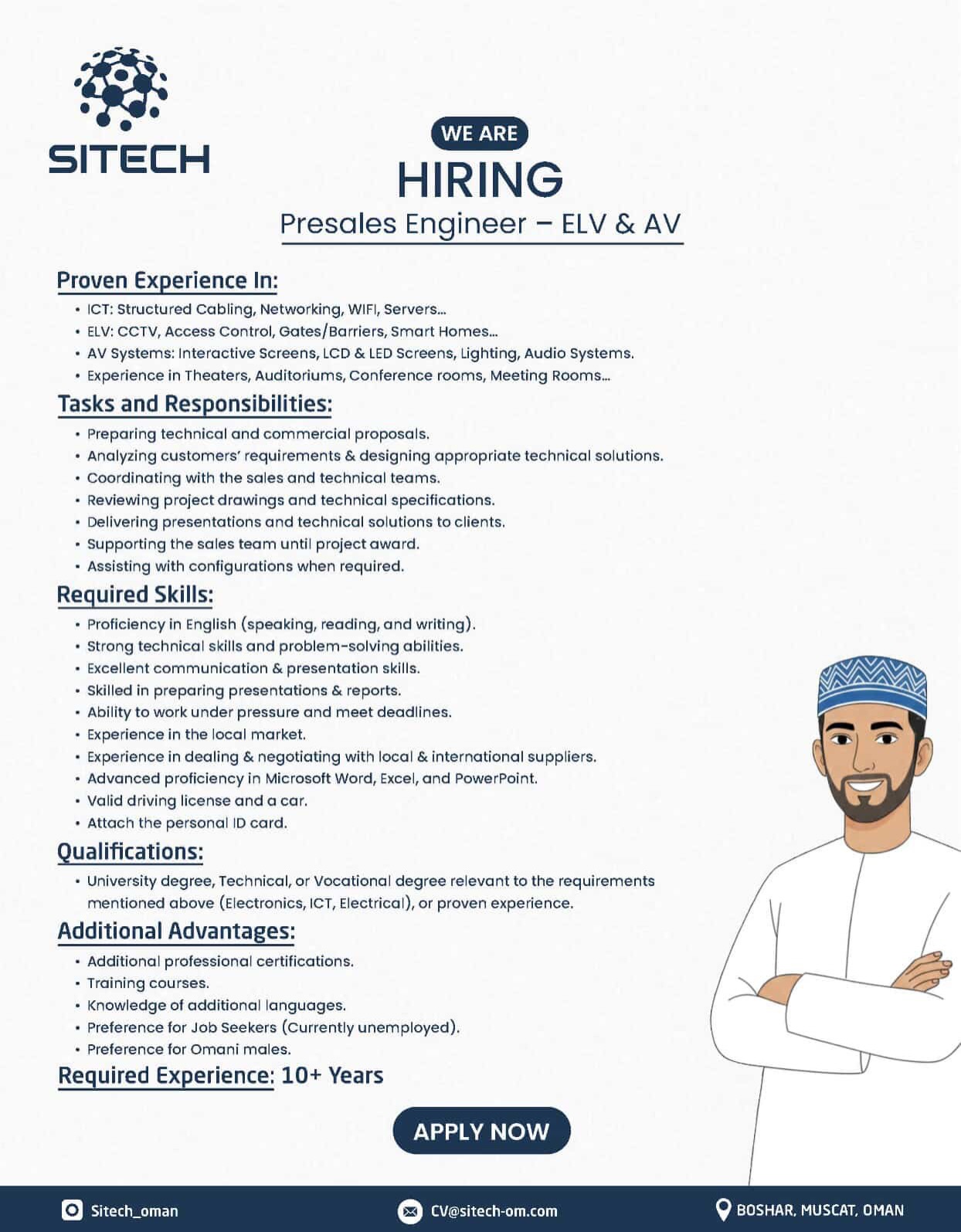 إذا كنت تبحث عن فرصة عمل مهنية في سلطنة عمان مع إحدى الشركات الرائدة في مجال التكنولوجيا والصيانة، فإن Sitech تقدم لك الفرصة المثالية. سواء كنت مهندسًا مبيعاتيًا في ELV & AV أو متخصصًا في مبيعات عقود الصيانة، فإن هذه الوظائف توفر لك فرصة لتطوير مهاراتك والعمل في بيئة متطورة.