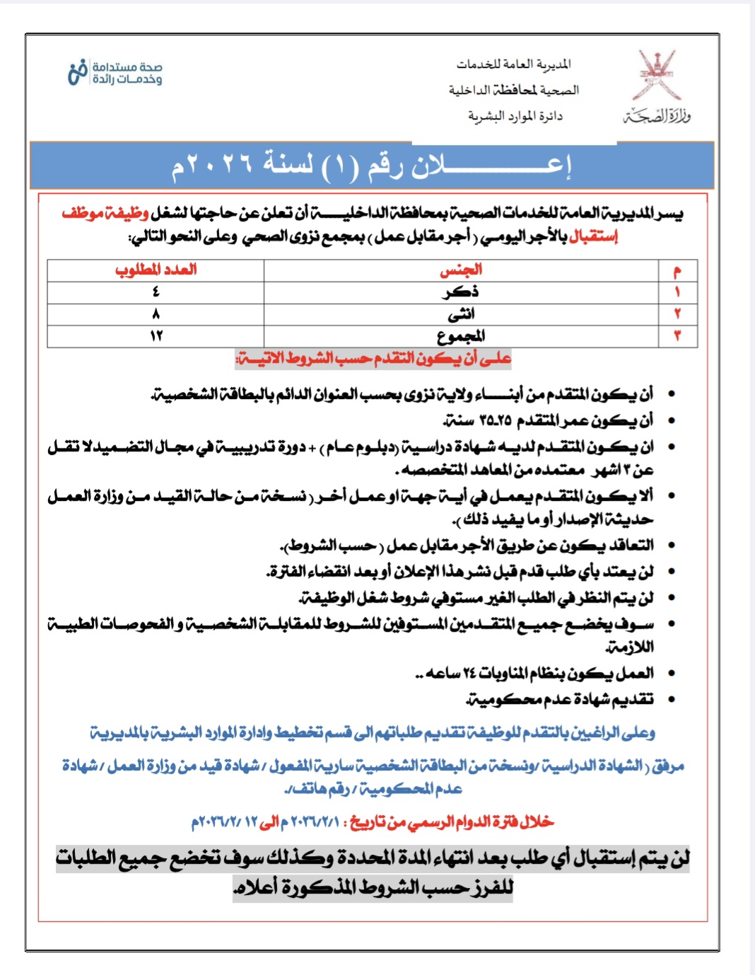 تعلن المديرية العامة للخدمات الصحية بمحافظة الداخلية عن فتح باب التقديم لشغل وظيفة موظف استقبال بالأجر اليومي في مجمع نزوى الصحي، وذلك ضمن فرص وظائف في سلطنة عمان لعام 2026، وفق الشروط والتفاصيل التالية: