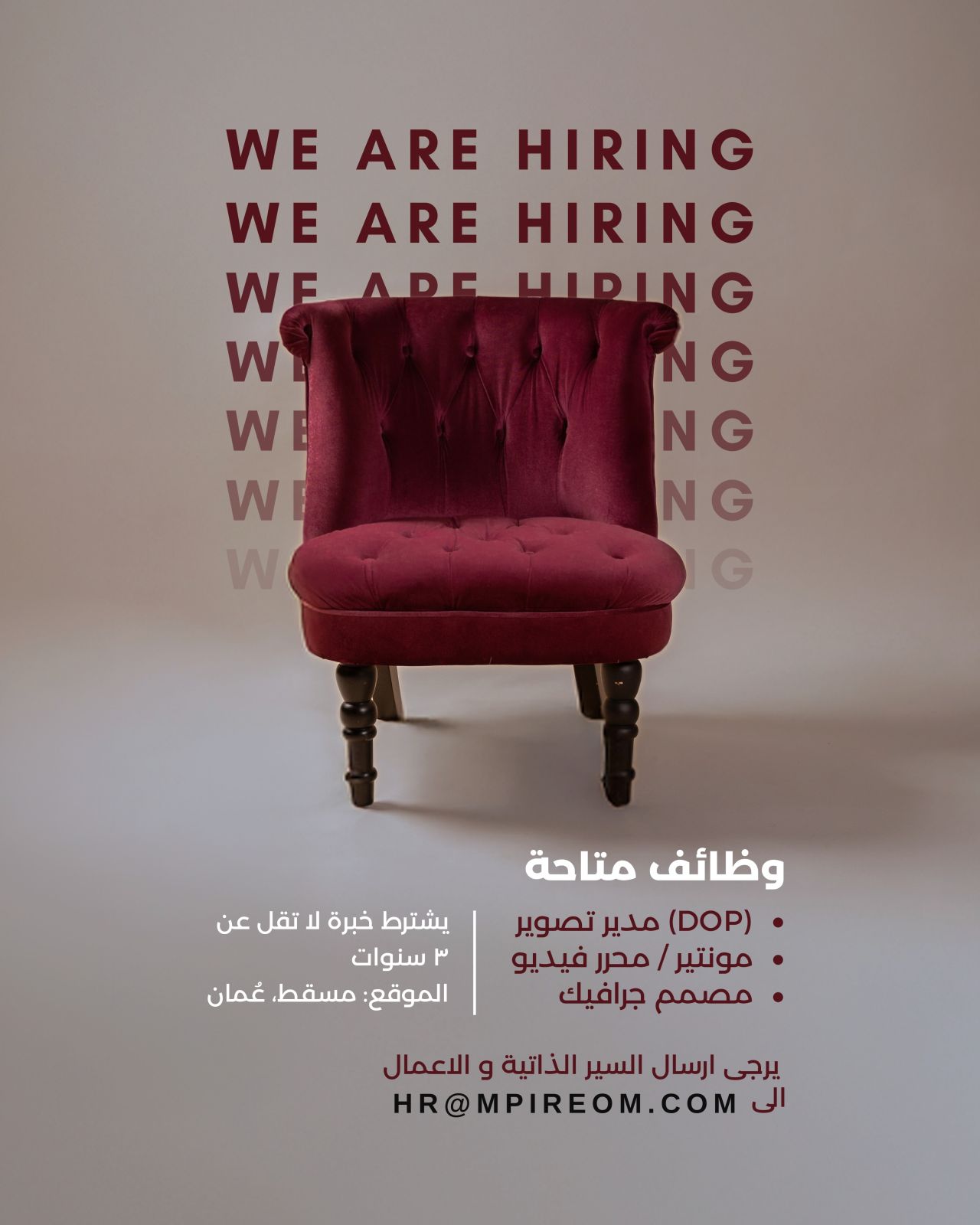 تعلن Mpire Productions عن حاجتها لشغل المناصب التالية ضمن فريقها في مسقط، عُمان وهضيت بناء على ما تم الاعلان عنه رسميا من الجهات المختصة :