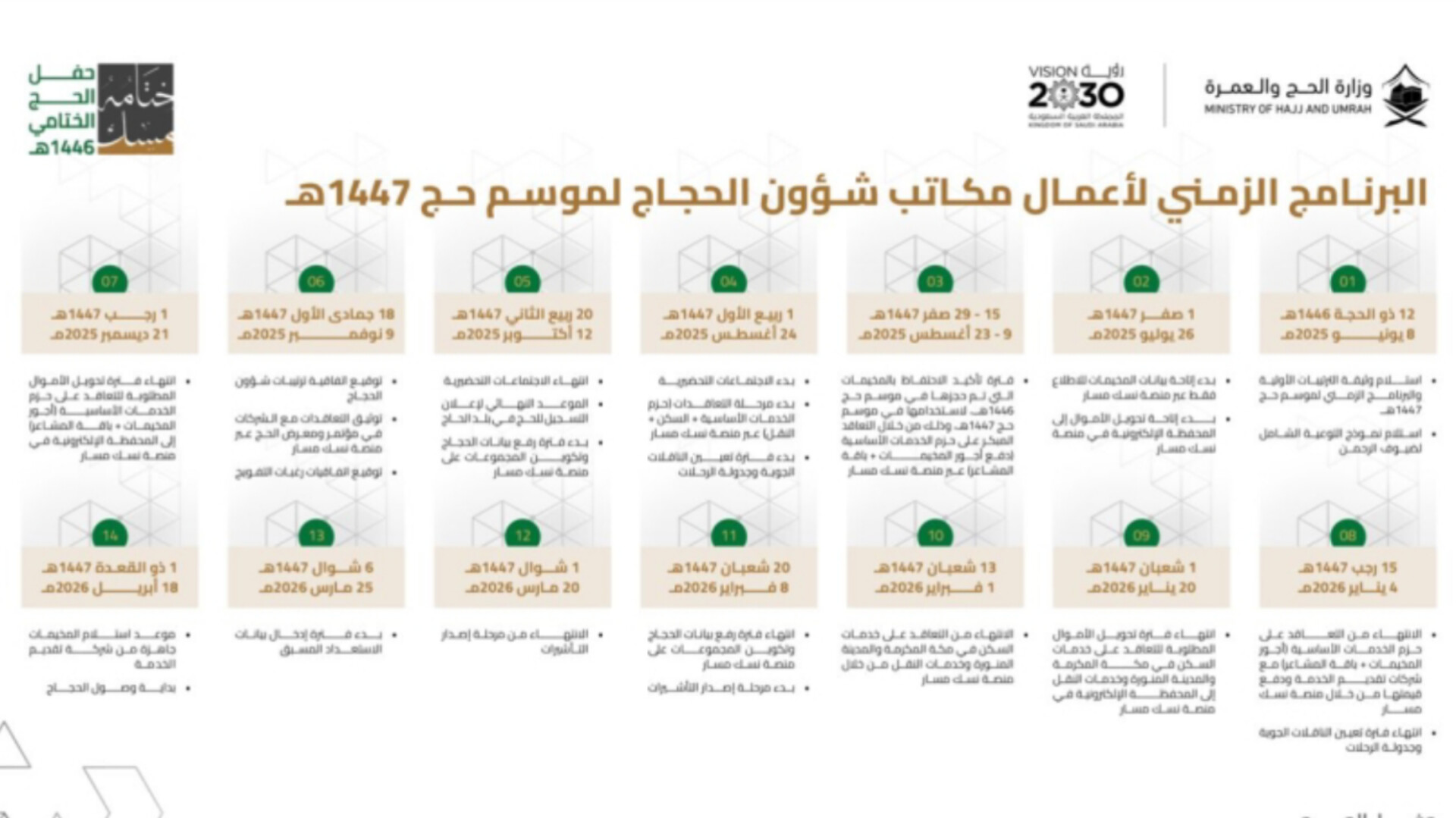 أعلنت وزارة الحج والعمرة عن برنامج حج 1447 هـ، موضحة الجدول الزمني التفصيلي لأعمال مكاتب شؤون الحجاج، مع تحديد 8 فبراير 2026 كبداية لمرحلة إصدار التأشيرات . ويعكس هذا الإعلان المبكر التزام الوزارة بالتخطيط المسبق لضمان تقديم خدمات عالية الجودة لضيوف الرحمن.
