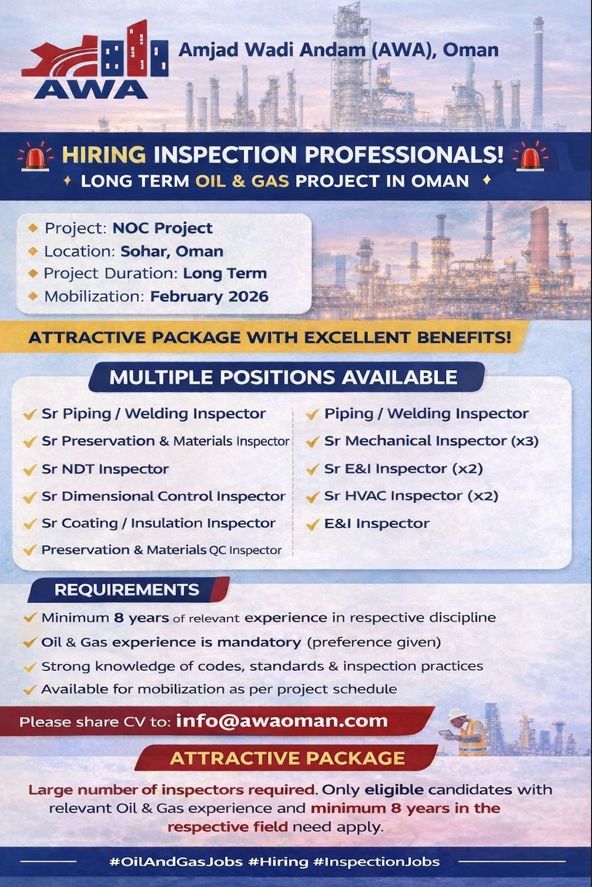 وظائف شركة أمجد وادي عندام، وظائف النفط والغاز في عمان، وظائف عمان 2026، وظائف مفتشين في سلطنة عمان، وظائف شركة AWA، وظائف صحار اليوم
