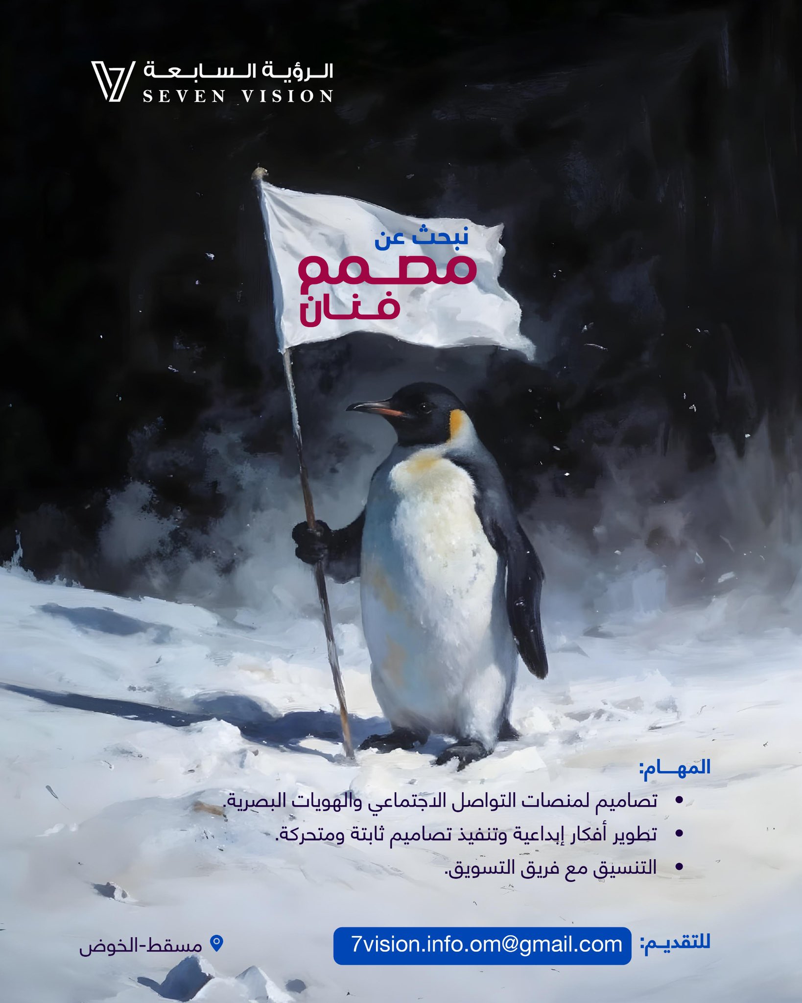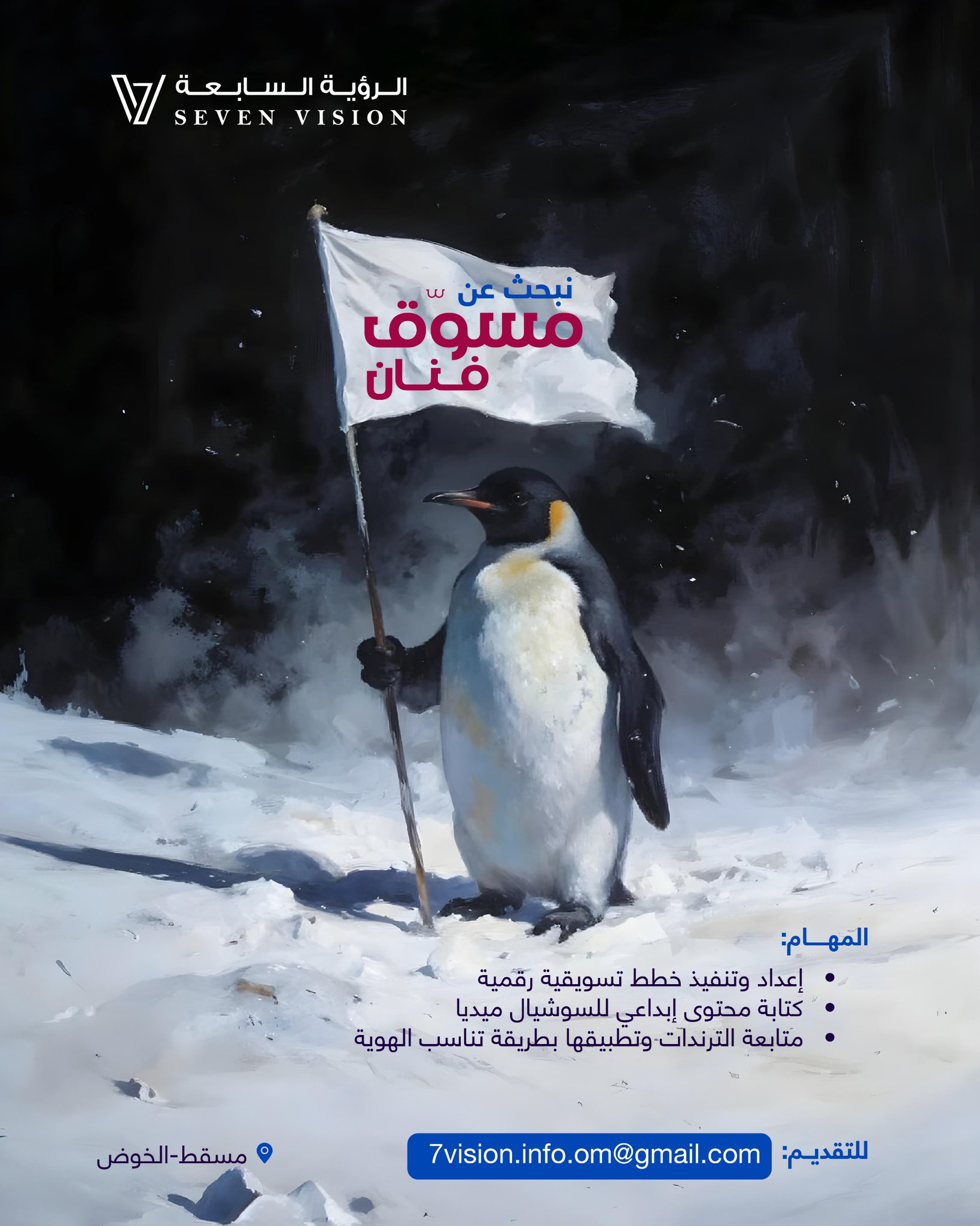 هل تبحث عن انطلاقة حقيقية لمسيرتك المهنية في قلب العاصمة العمانية؟ إذا كنت تمتلك الشغف وترغب في الانضمام إلى بيئة عمل ملهمة، فإن شركة الرؤية السابعة (Seven Vision) في مسقط - منطقة الخوض، تفتح أبوابها لاستقطاب كفاءات جديدة تحت شعار "نبحث عن فنان" .