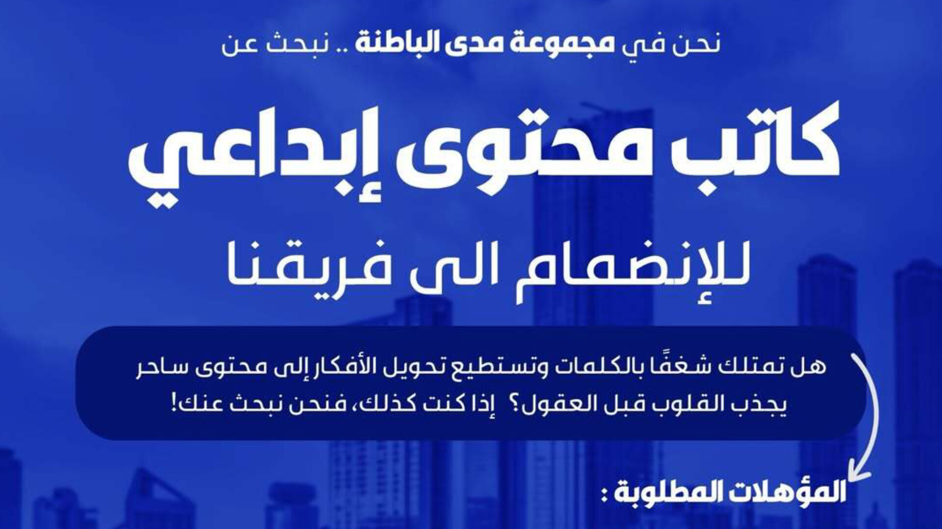 تواصل مجموعة مدى الباطنة في سلطنة عمان توسيع فريقها الإبداعي، حيث أعلنت مؤخرًا عن توفر وظيفة شاغرة بمسمى كاتب محتوى إبداعي، في خطوة تعكس حرصها على تعزيز حضورها الإعلامي والتسويقي بمحتوى احترافي قادر على التأثير وجذب الجمهور عبر مختلف المنصات الرقمية .
