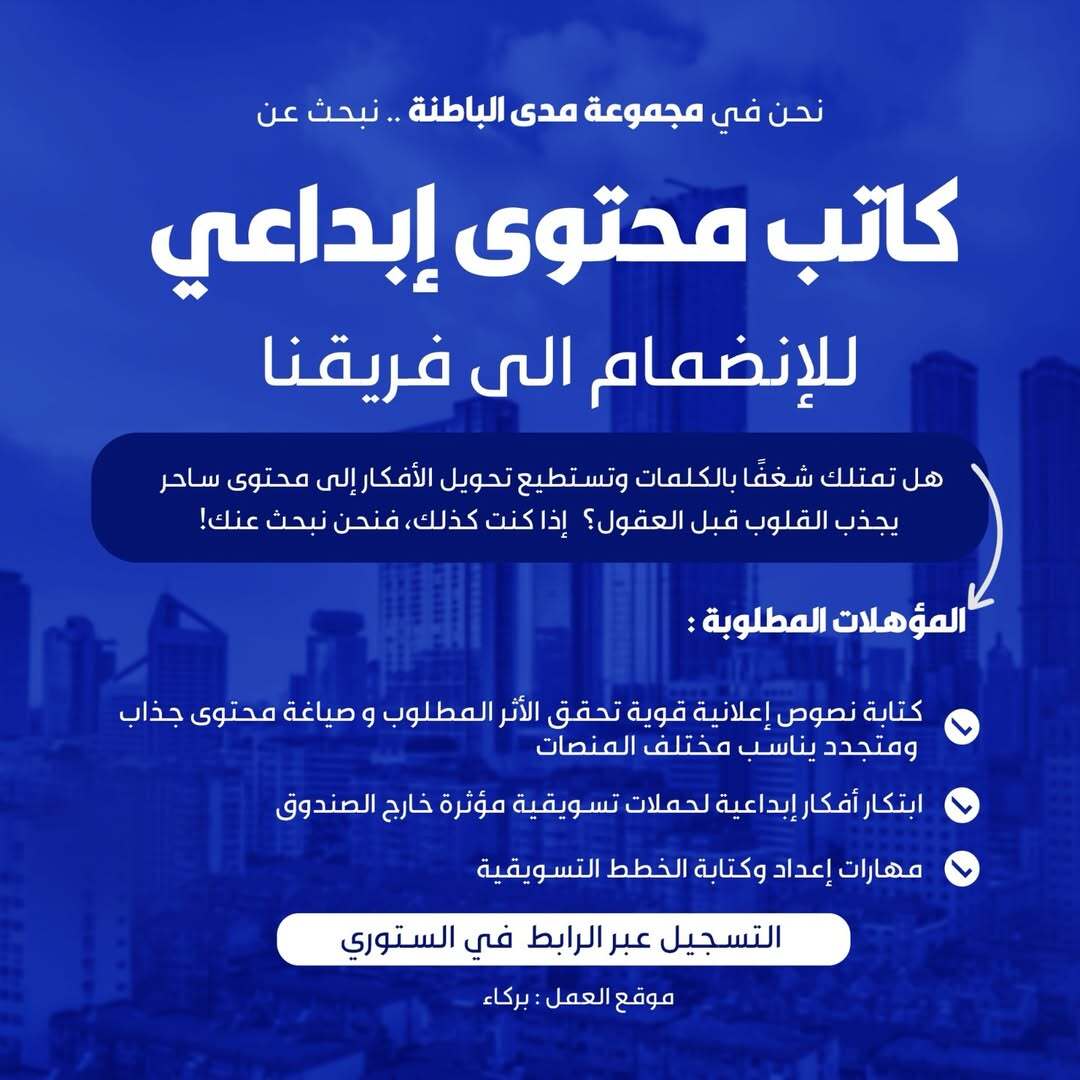 تسعى مجموعة مدى الباطنة إلى استقطاب كاتب محتوى يتمتع بحس إبداعي عالٍ، قادر على صياغة محتوى جذاب يلامس اهتمامات الجمهور، ويعكس هوية العلامة التجارية بأسلوب احترافي ومتجدد. ويشمل الدور الوظيفي إنتاج نصوص إعلانية وتسويقية تحقق الأثر المطلوب، مع مراعاة اختلاف المنصات والجمهور المستهدف.