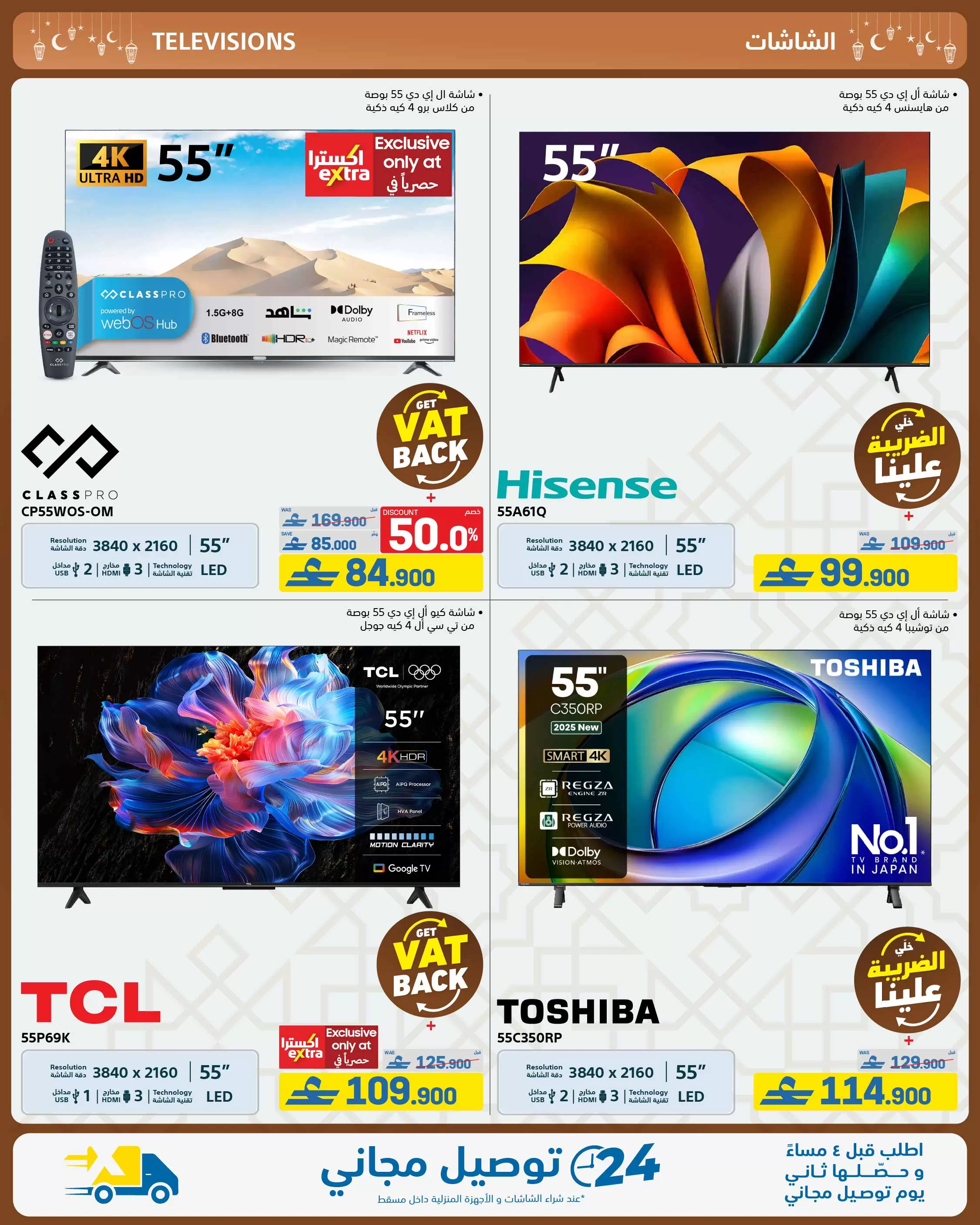 تعتبر شاشات الـ 4K Smart هي الأكثر طلباً في عروض تلفزيونات اكسترا عمان. إليك أبرز الصفقات: