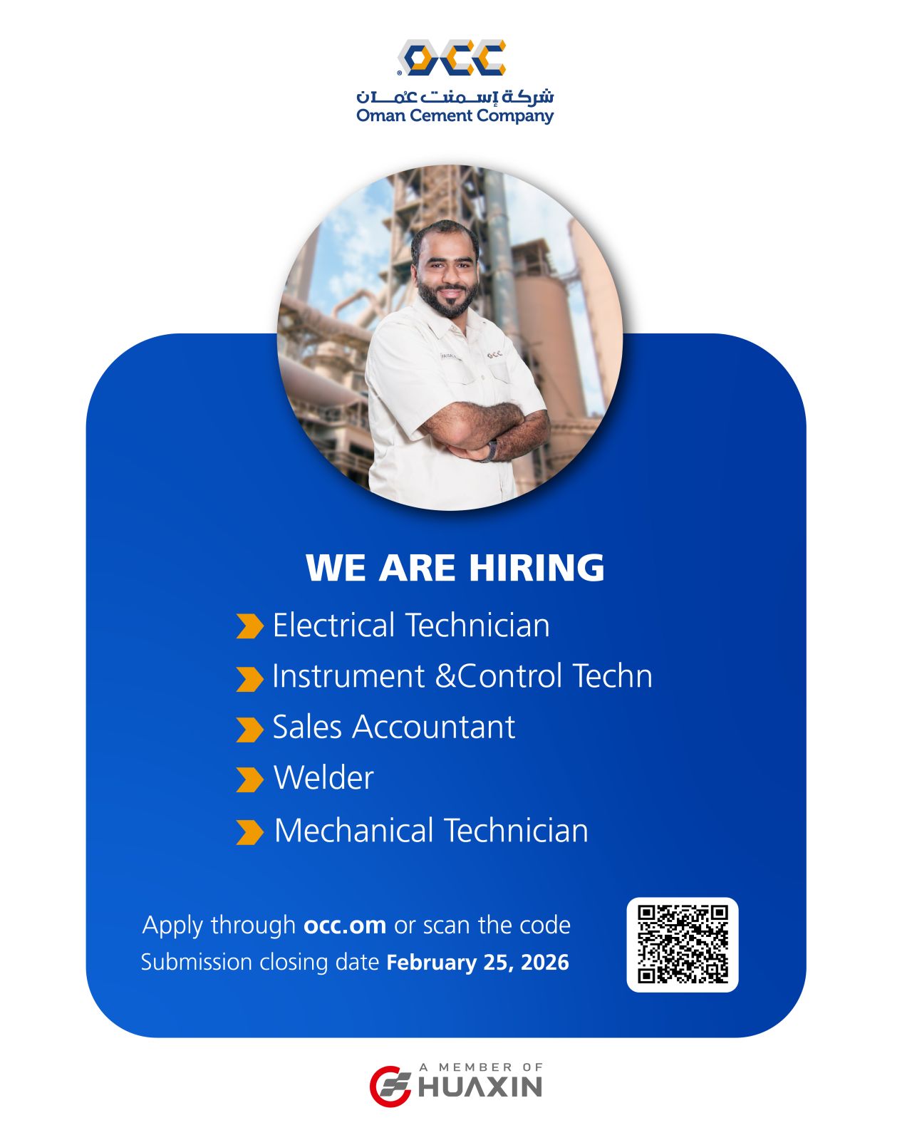 تستمر سلطنة عُمان في تعزيز كوادرها الوطنية والمهنية في القطاع الصناعي، وفي هذا السياق، أعلنت شركة أسمنت عُمان (Oman Cement Company)، الرائدة في صناعة البناء والتشييد والعضو في مجموعة "هواشين" (Huaxin)، عن فتح باب التوظيف لشغل 5 وظائف تخصصية شاغرة للكوادر الطموحة الراغبة في الانضمام إلى بيئة عمل مستقرة ومتطورة .