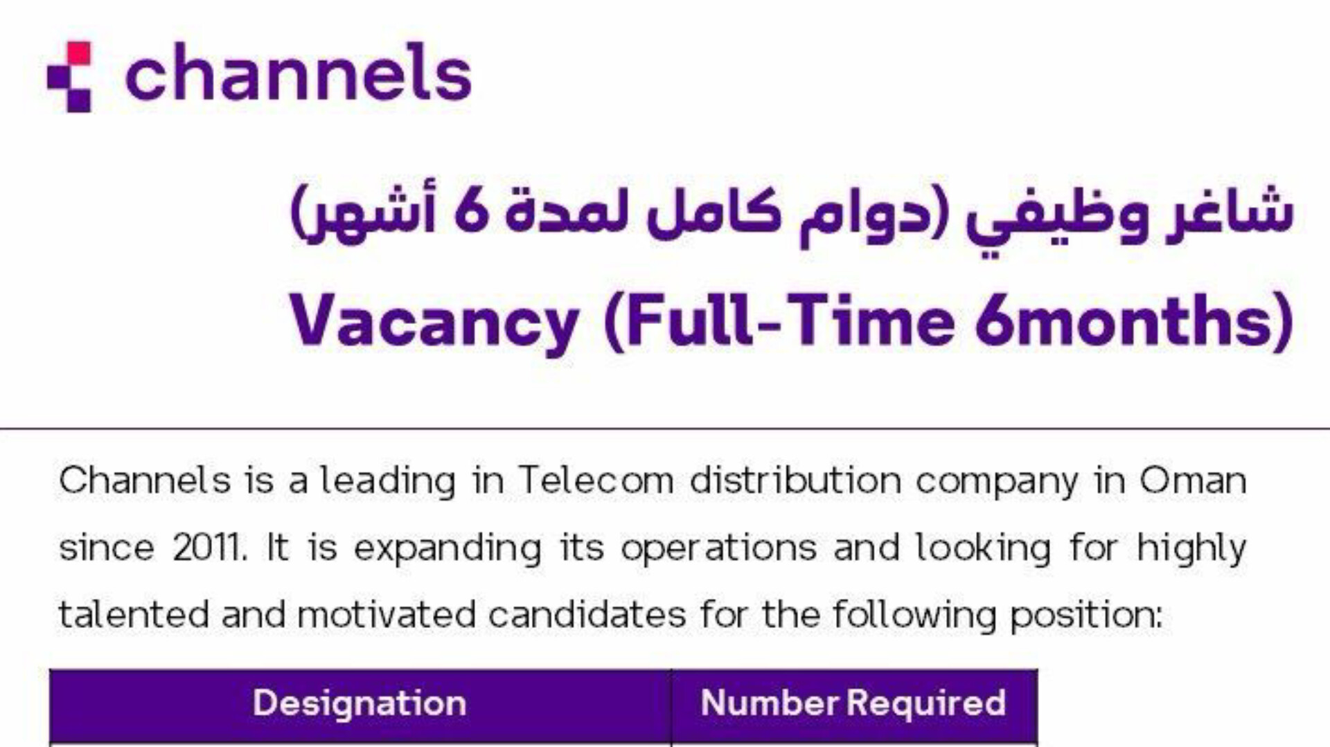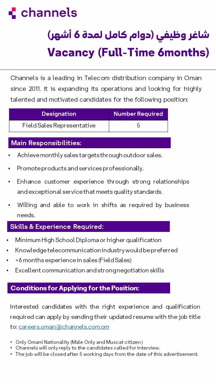 تستمر سلطنة عمان في تعزيز سوق العمل المحلي من خلال طرح فرص وظيفية مميزة للشباب الطموح . وفي أحدث إعلان لها، كشفت شركة Channels، الرائدة في مجال توزيع الاتصالات بالسلطنة منذ عام 2011، عن فتح باب التوظيف لشغل وظائف "مندوب مبيعات ميداني" (Field Sales Representative) بنظام الدوام الكامل ولمدة 6 أشهر.