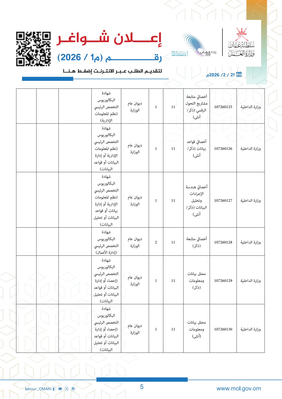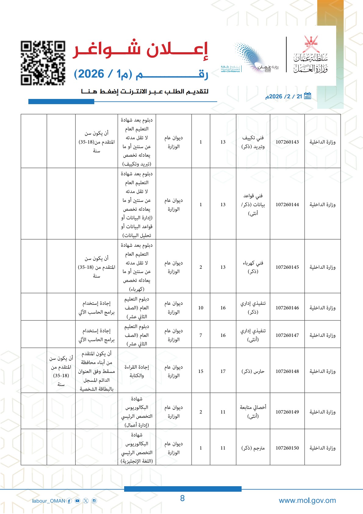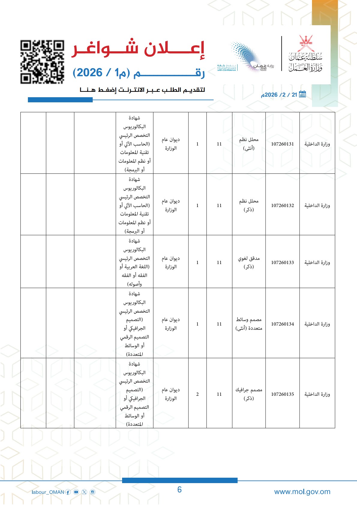 الكلمات المفتاحية: وزارة العمل سلطنة عمان، وظائف سلطنة عمان 2026، ملحق وظائف وزارة العمل، تسجيل وظائف عمان، رؤية عمان 2040، فرص عمل للعمانيين، تطبيق معاك، وظائف وزارة الداخلية عمان.