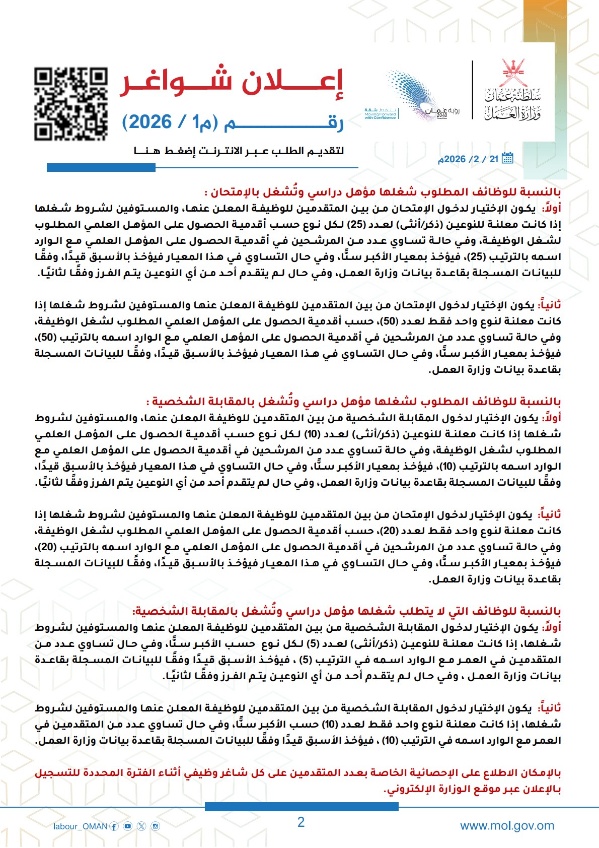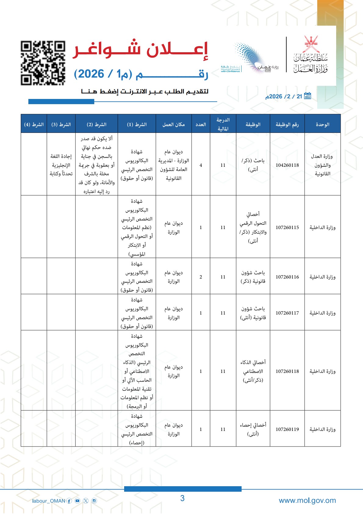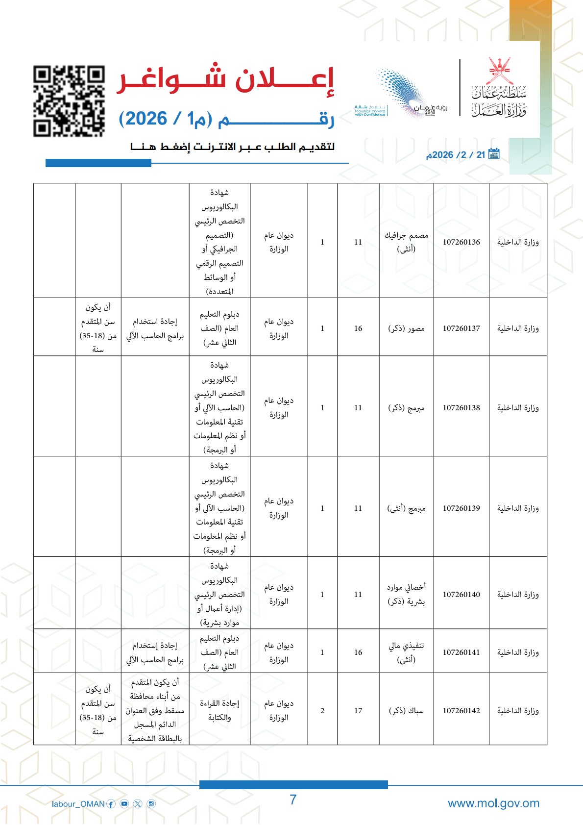 الكلمات المفتاحية: وزارة العمل سلطنة عمان، وظائف سلطنة عمان 2026، ملحق وظائف وزارة العمل، تسجيل وظائف عمان، رؤية عمان 2040، فرص عمل للعمانيين، تطبيق معاك، وظائف وزارة الداخلية عمان.