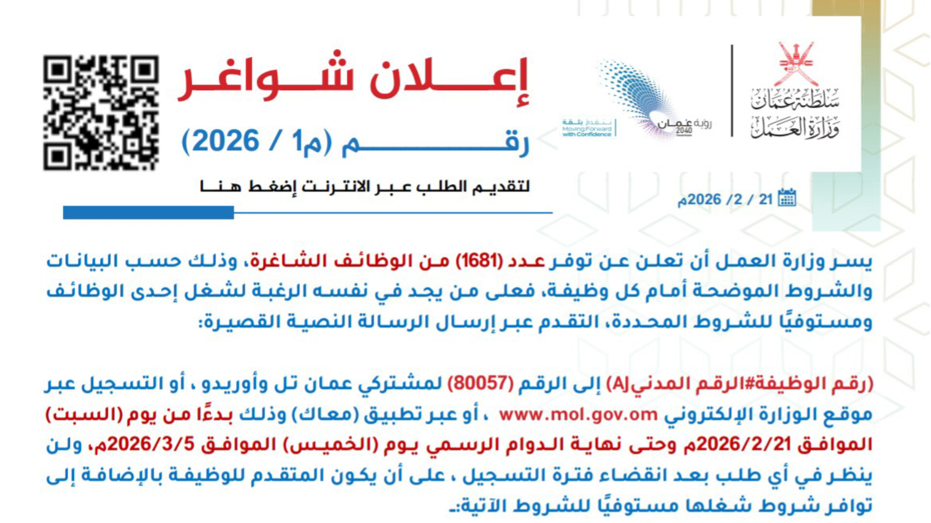 تصدرت وزارة العمل في سلطنة عمان محركات البحث ومنصات التواصل الاجتماعي بعد إعلانها الرسمي عن طرح 1681 وظيفة شاغرة بنظام العقود والتعيين في مختلف الوحدات الحكومية . يأتي هذا الإعلان (رقم 1 / م / 2026) في إطار الجهود المستمرة لتمكين الكوادر الوطنية العمانية ورفد القطاع الحكومي بكفاءات شابة تساهم في تحقيق رؤية عمان 2040.
