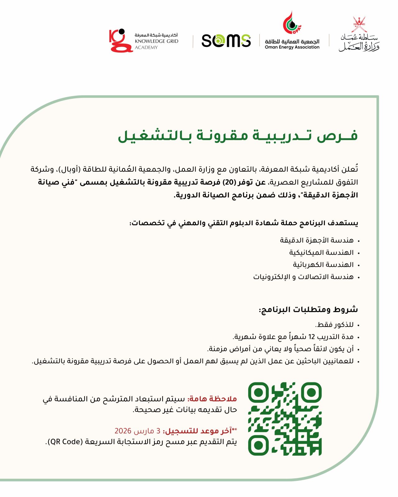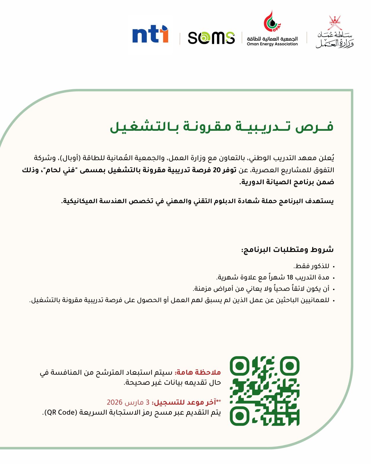 تعلن الجمعية العمانية للطاقة (أوبال) بالتعاون مع وزارة العمل، وشركاء القطاع الخاص المتمثلين في معهد التدريب الوطني (NTI)، ومعهد التدريب التقني والإداري (TATI)، وأكاديمية شبكة المعرفة، وشركة التفوق للمشاريع العصرية، عن توفر فرص تدريبية مقرونة بالتشغيل ضمن برنامج الصيانة الدورية لعام 2026 .