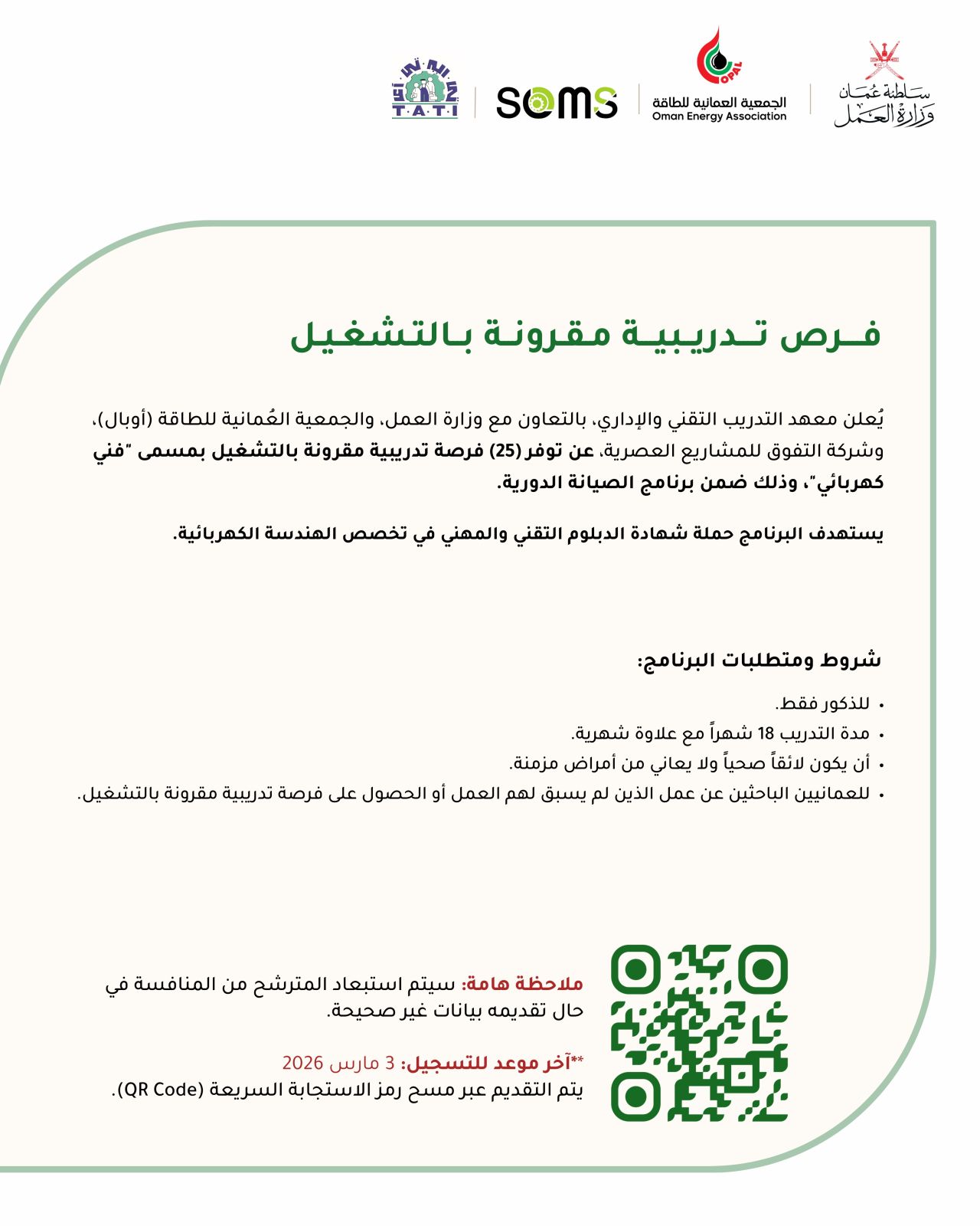 يُعلن معهد التدريب التقني والإداري بالتعاون مع وزارة العمل والجمعية العمانية للطاقة (أوبال) وشركة التفوق للمشاريع العصرية عن توفر فرص تدريبية مقرونة بالتشغيل بمسمى "فني كهربائي" ضمن برنامج الصيانة الدورية. يستهدف البرنامج حملة شهادة الدبلوم التقني والمهني في تخصص: