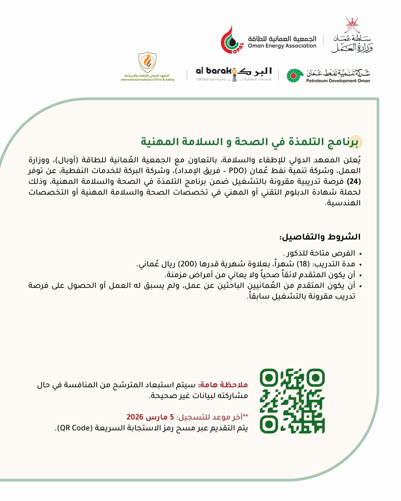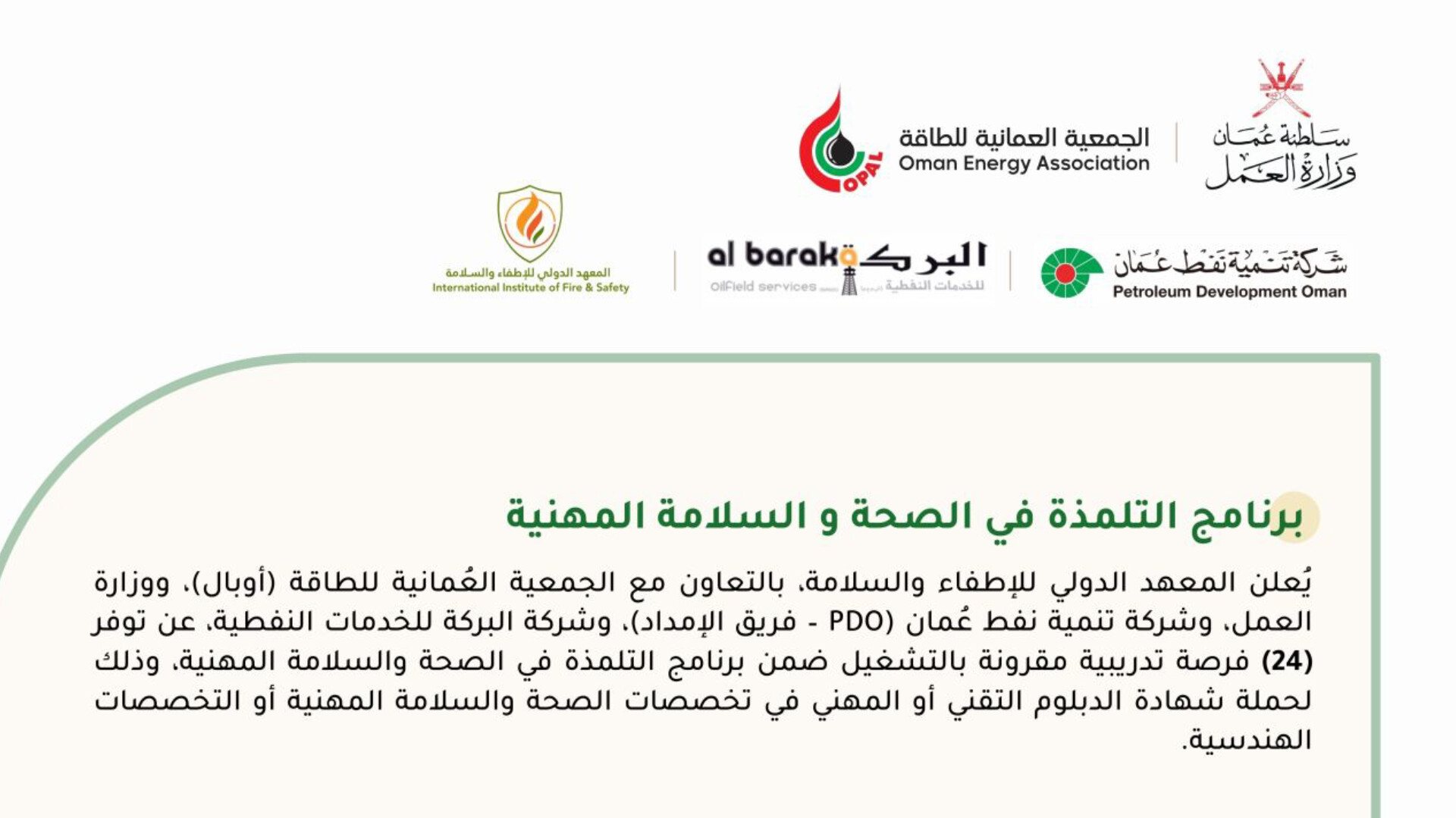 أعلن المعهد الدولي للإطفاء والسلامة، بالتعاون مع الجمعية العمانية للطاقة (أوبال)، ووزارة العمل، وشركة تنمية نفط عمان (PDO - فريق الإمداد)، وشركة البركة للخدمات النفطية، عن توفر (24) فرصة تدريبية مقرونة بالتشغيل ضمن برنامج التلمذة في الصحة والسلامة المهنية، وذلك لحملة شهادة الدبلوم التقني أو المهني في تخصصات الصحة والسلامة المهنية أو التخصصات الهندسية .