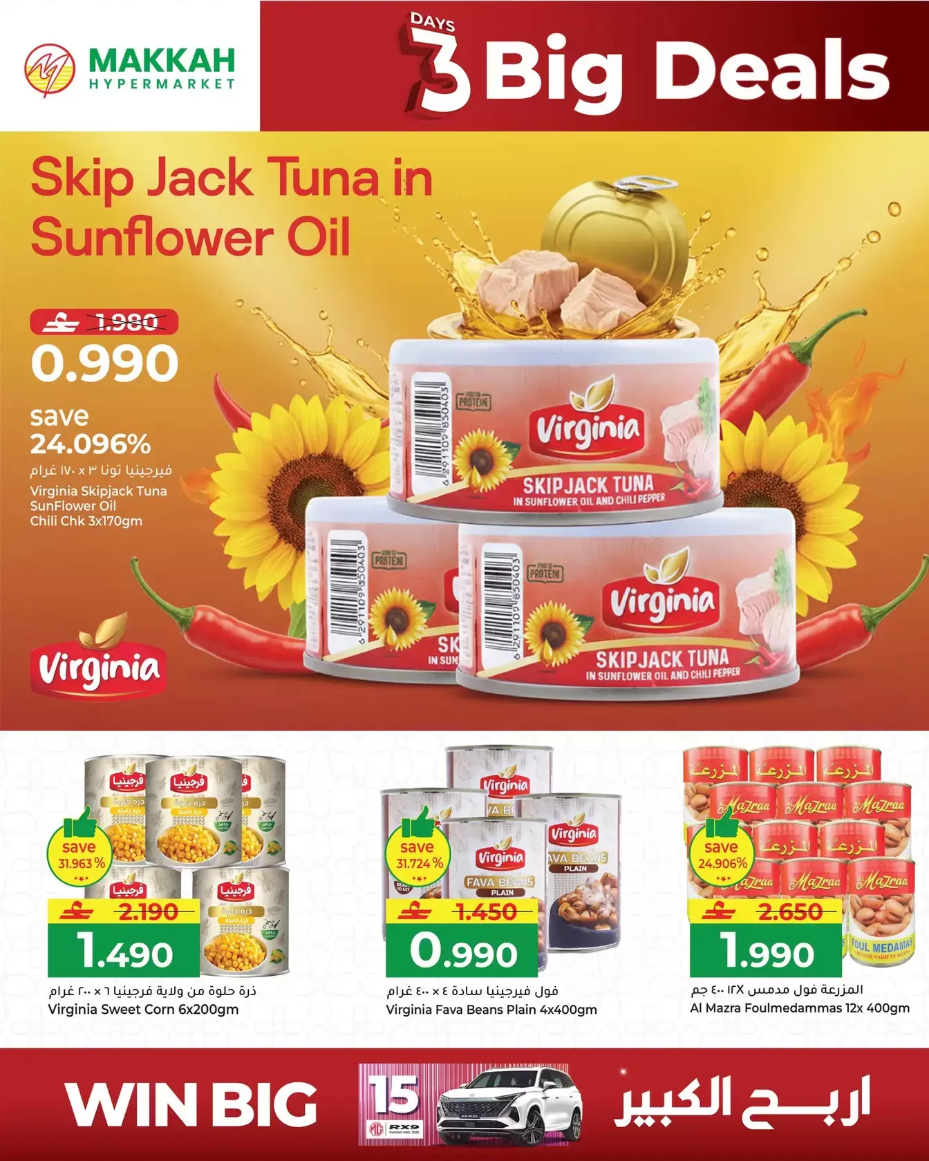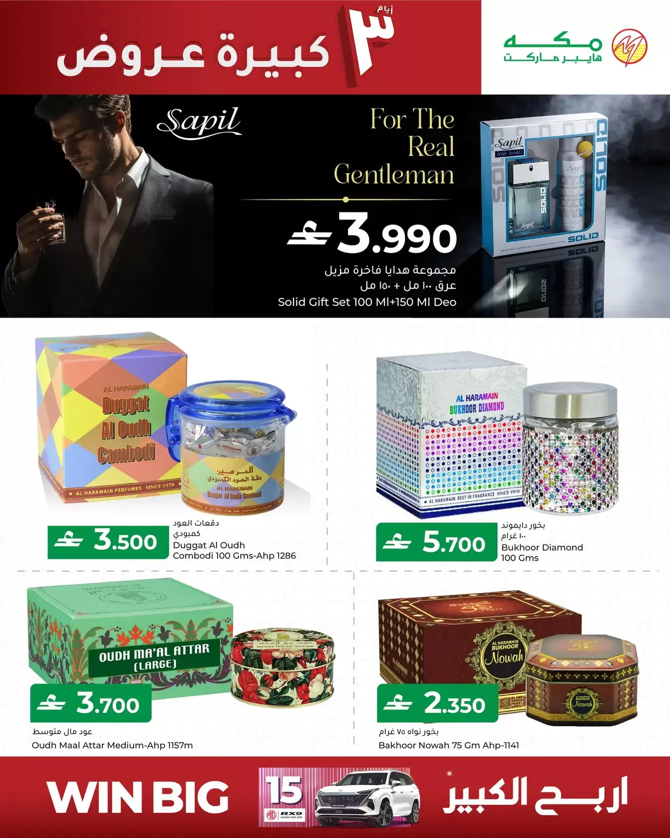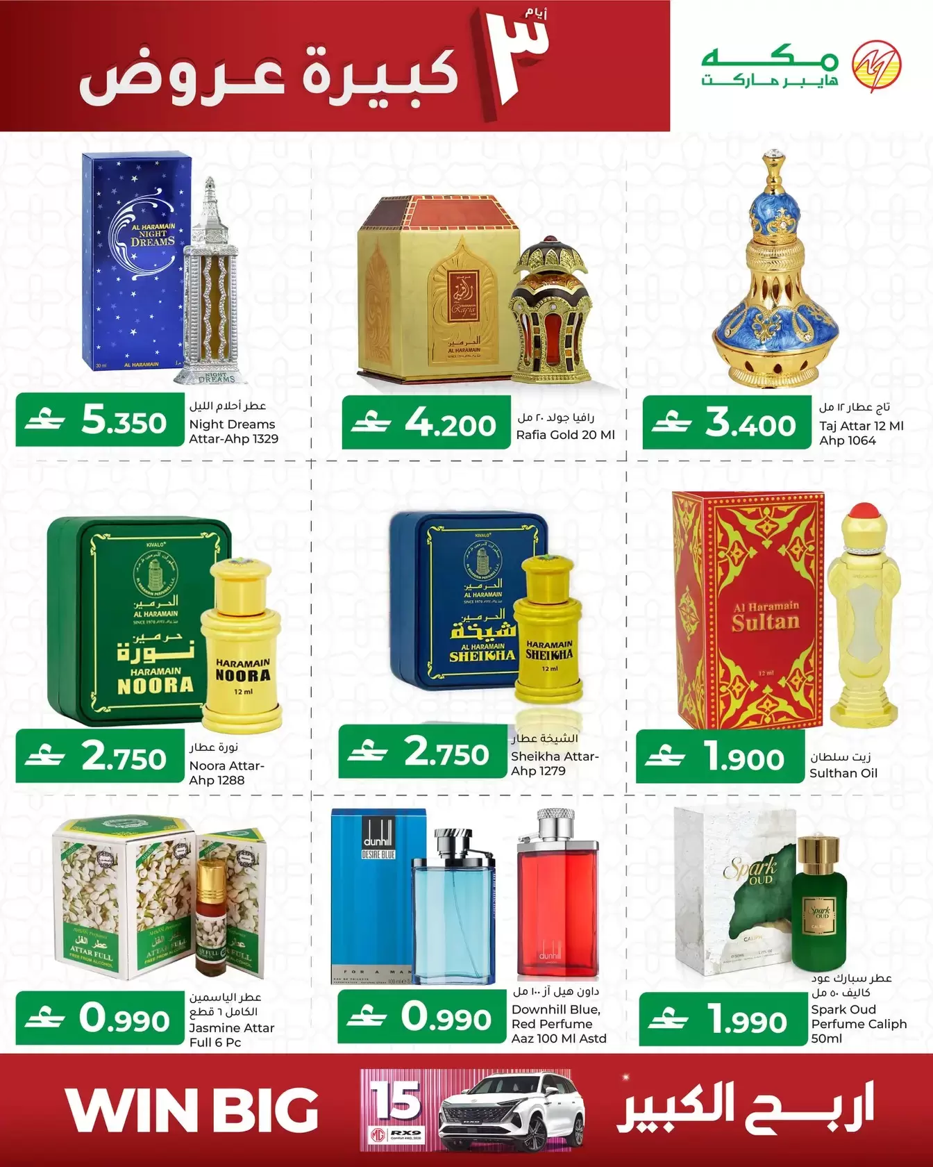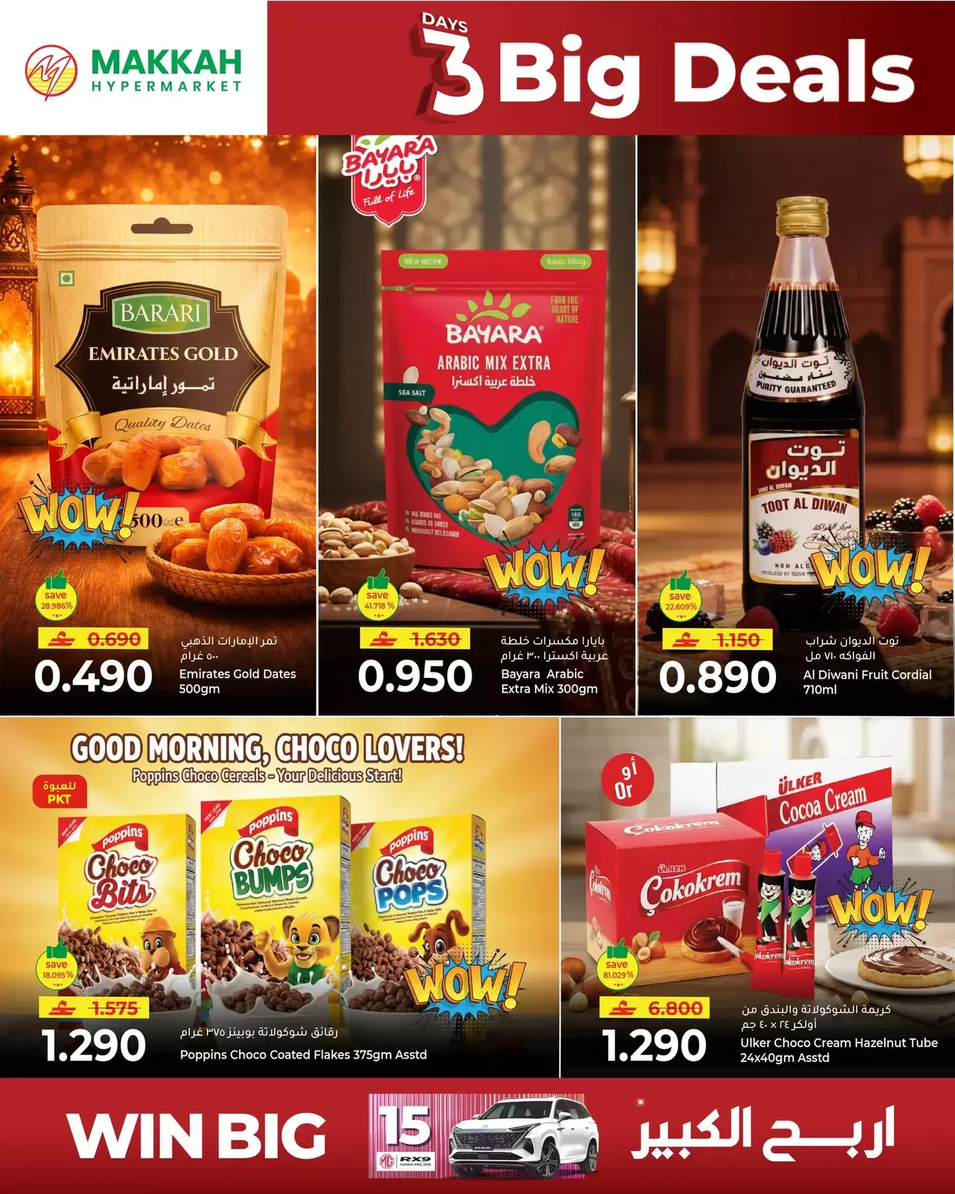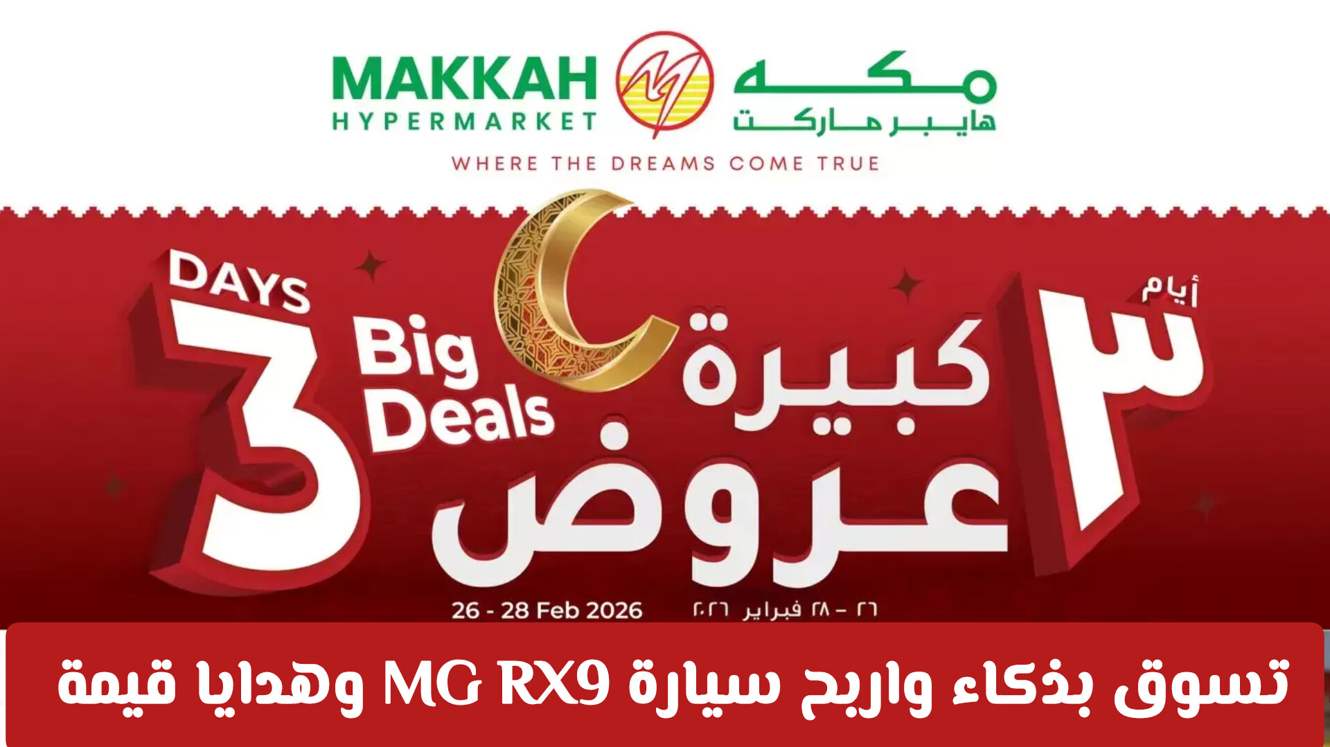 هل تبحث عن أفضل عروض الهايبر ماركت في سلطنة عمان؟ أطلق مكة هايبر ماركت (Makkah Hypermarket) مهرجان "3 أيام كبرى من العروض" (3 Big Deals)، والتي تشمل تخفيضات هائلة على المواد الغذائية، المستلزمات المنزلية، والعطور . تبدأ هذه العروض من 26 فبراير وحتى 28 فبراير 2026، مع فرص ذهبية لربح سيارة MG RX9 و150 جائزة أخرى!
