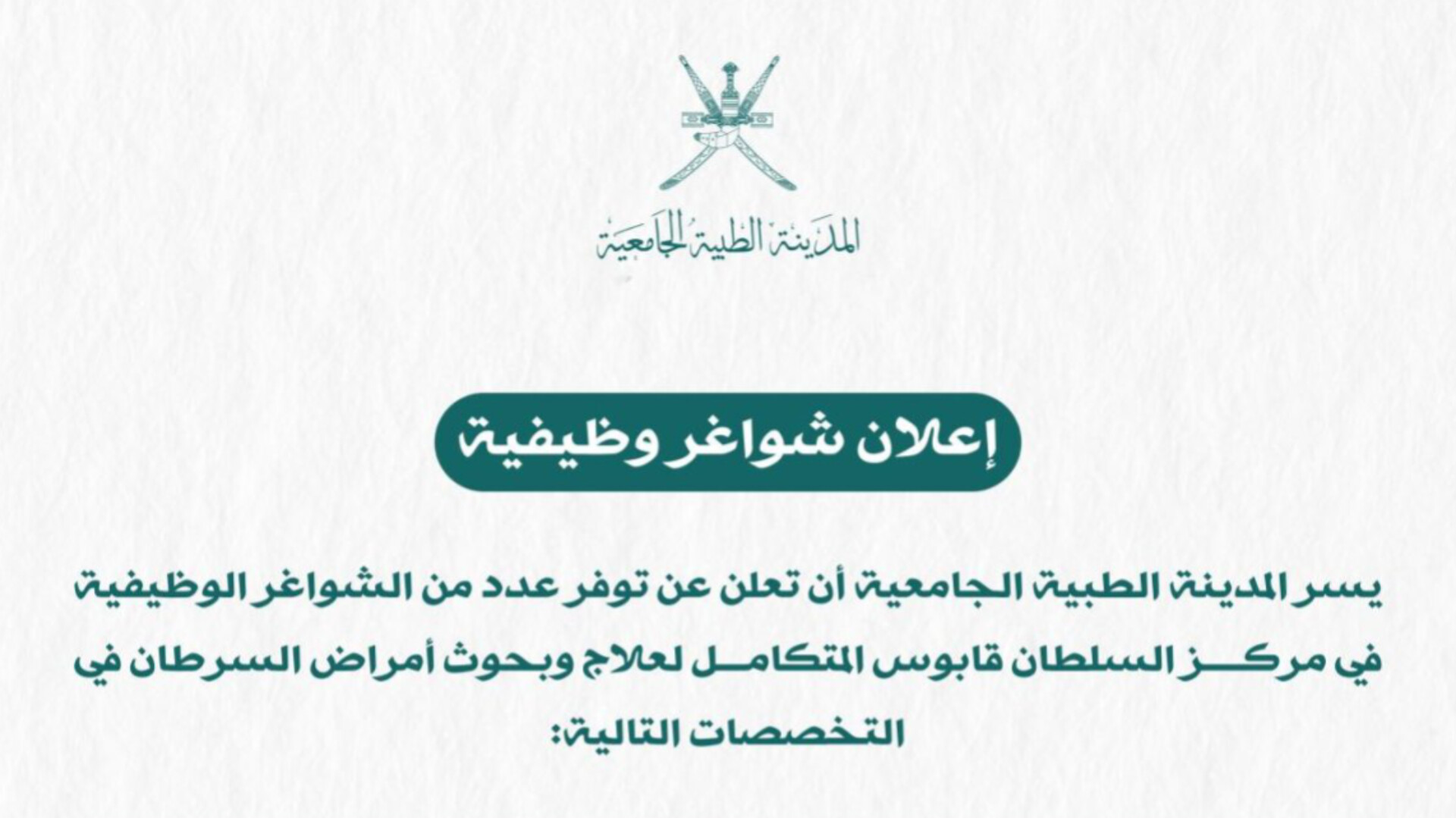 تفتح المدينة الطبية الجامعية في سلطنة عمان أبواب التميز المهني من جديد، حيث أعلنت عن طرح مجموعة من الشواغر الوظيفية المرموقة للكوادر الطبية المتخصصة . تستهدف هذه الوظائف الانضمام إلى فريق العمل بنخبة المؤسسات الصحية، وتحديداً في مركز السلطان قابوس المتكامل لعلاج وبحوث أمراض السرطان، للمساهمة في تقديم رعاية صحية عالمية المستوى.