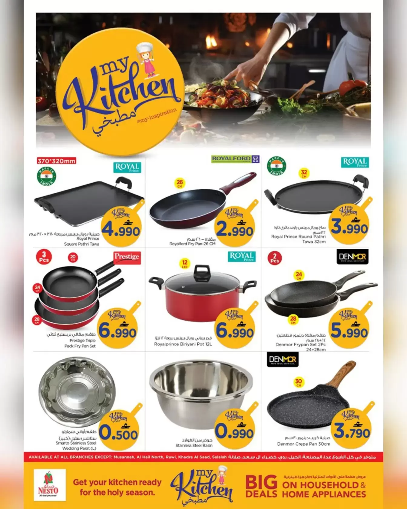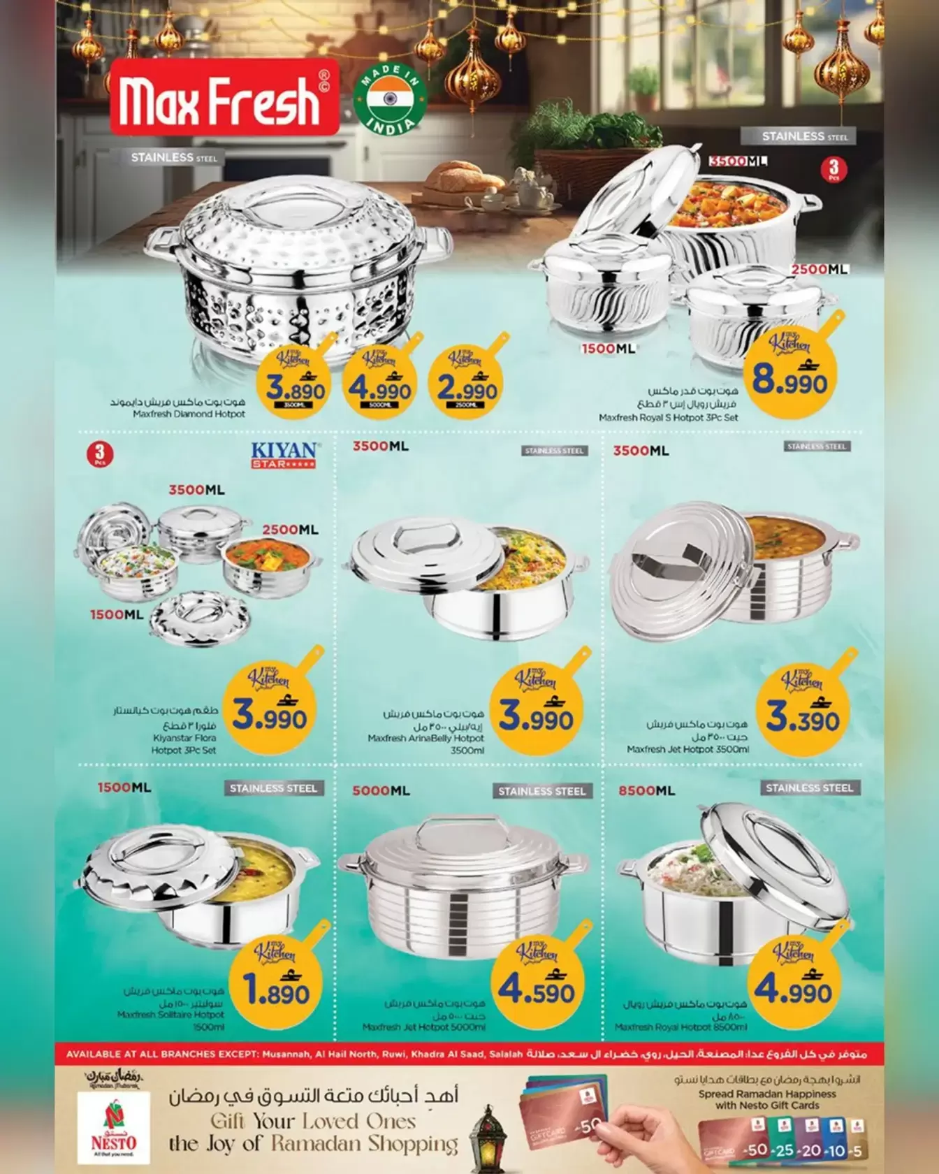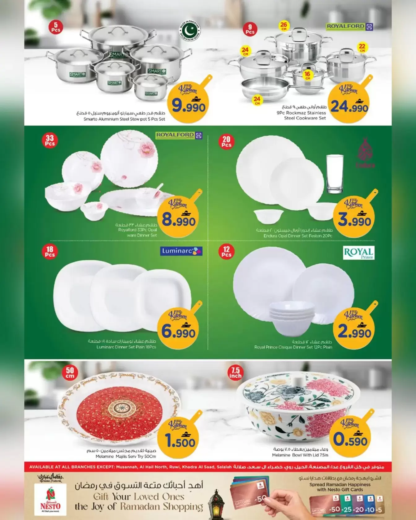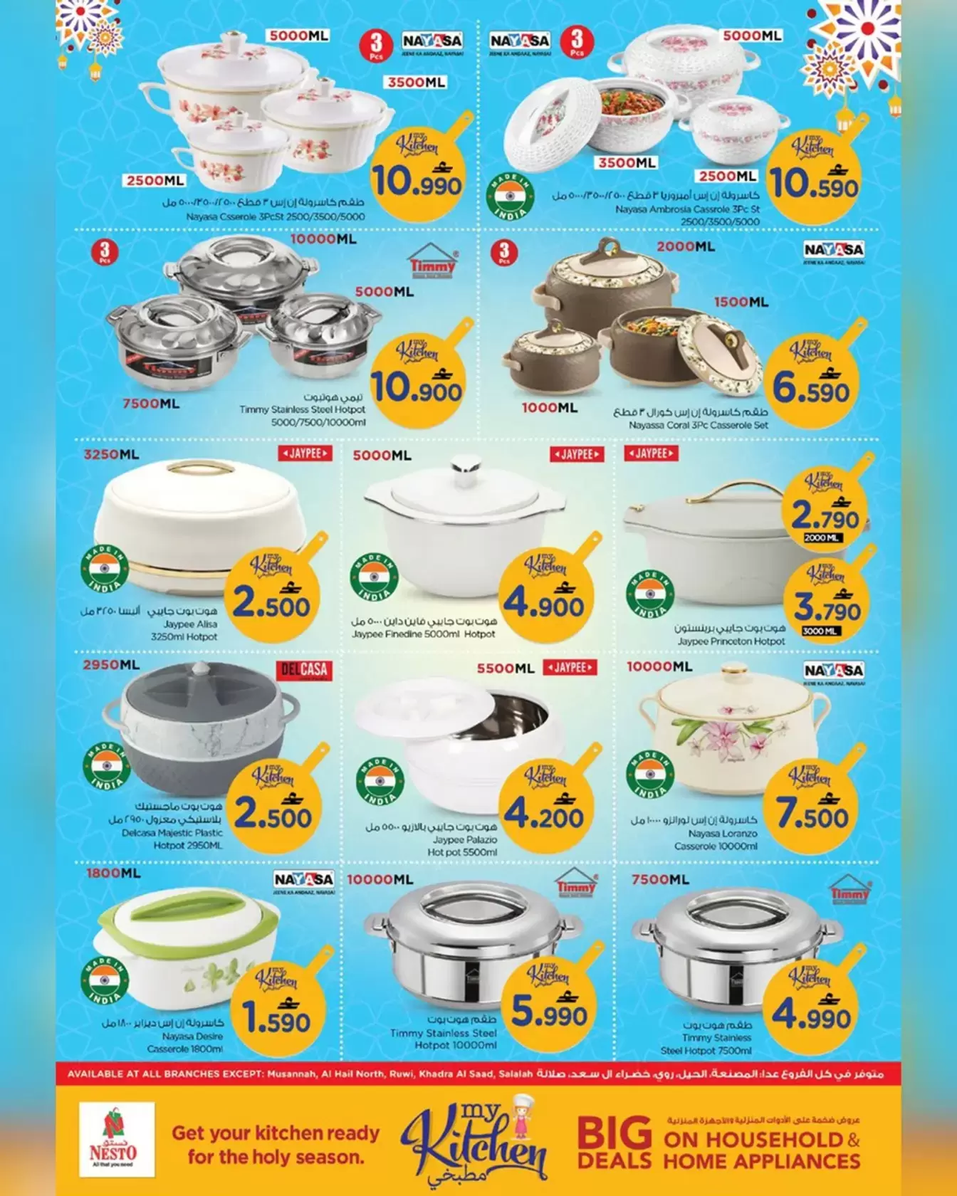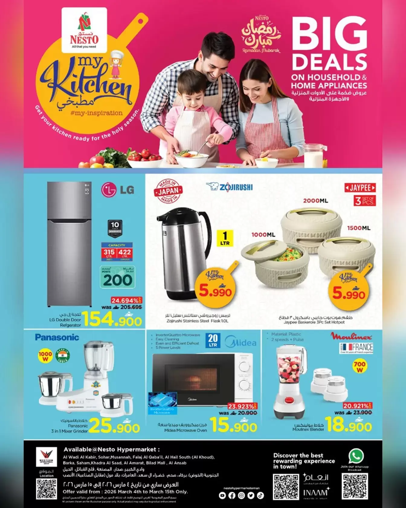 مع اقتراب الشهر الفضيل، يبدأ البحث عن أفضل عروض الأواني المنزلية في سلطنة عمان . أطلقت "نستو هايبر ماركت" مهرجانها السنوي تحت شعار "مطبخي"، والذي يقدم تخفيضات هائلة على الأدوات الكهربائية، أطقم العشاء، وأدوات الطبخ التي لا غنى عنها في كل منزل عماني.