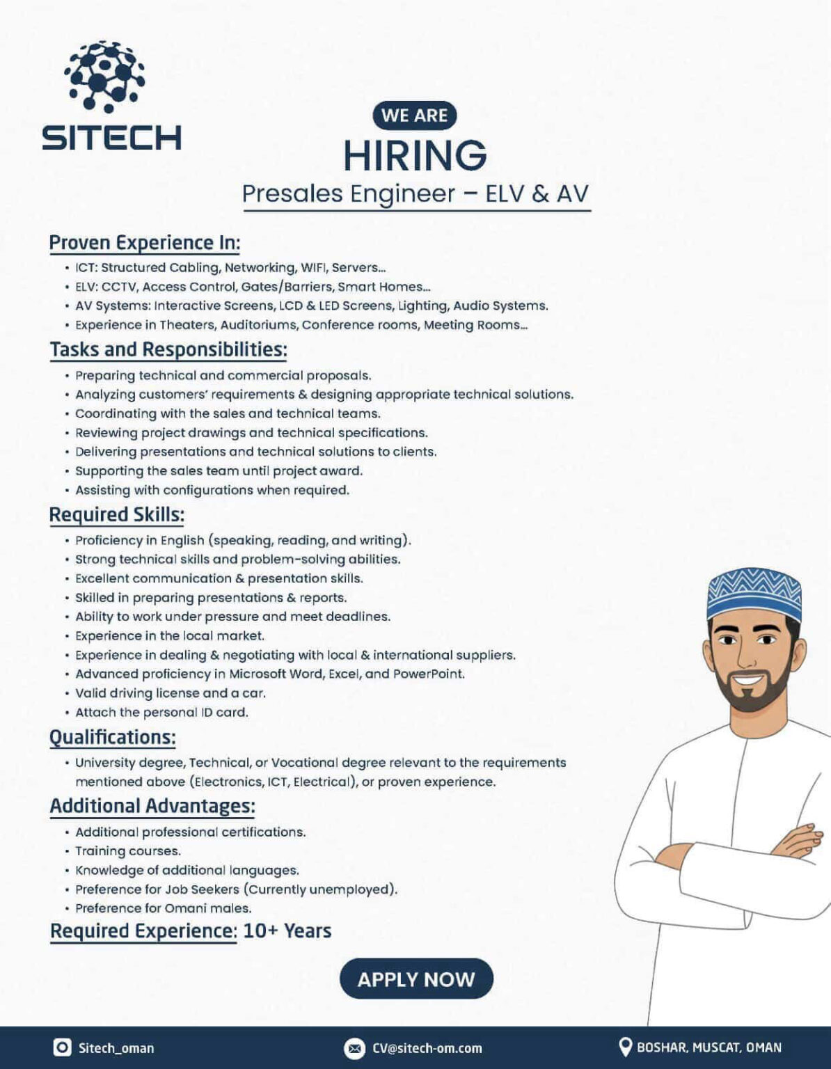 تبحث شركة سايتك (SITECH) الرائدة في تقديم الحلول التكنولوجية المتكاملة بسلطنة عمان عن كفاءات هندسية رفيعة المستوى للانضمام إلى فريقها المهني . يأتي هذا الإعلان في إطار سعي الشركة لتعزيز قسم الأنظمة التقنية بخبرات متخصصة في مجال أنظمة الجهد المنخفض (ELV) والأنظمة الصوتية والمرئية (AV).