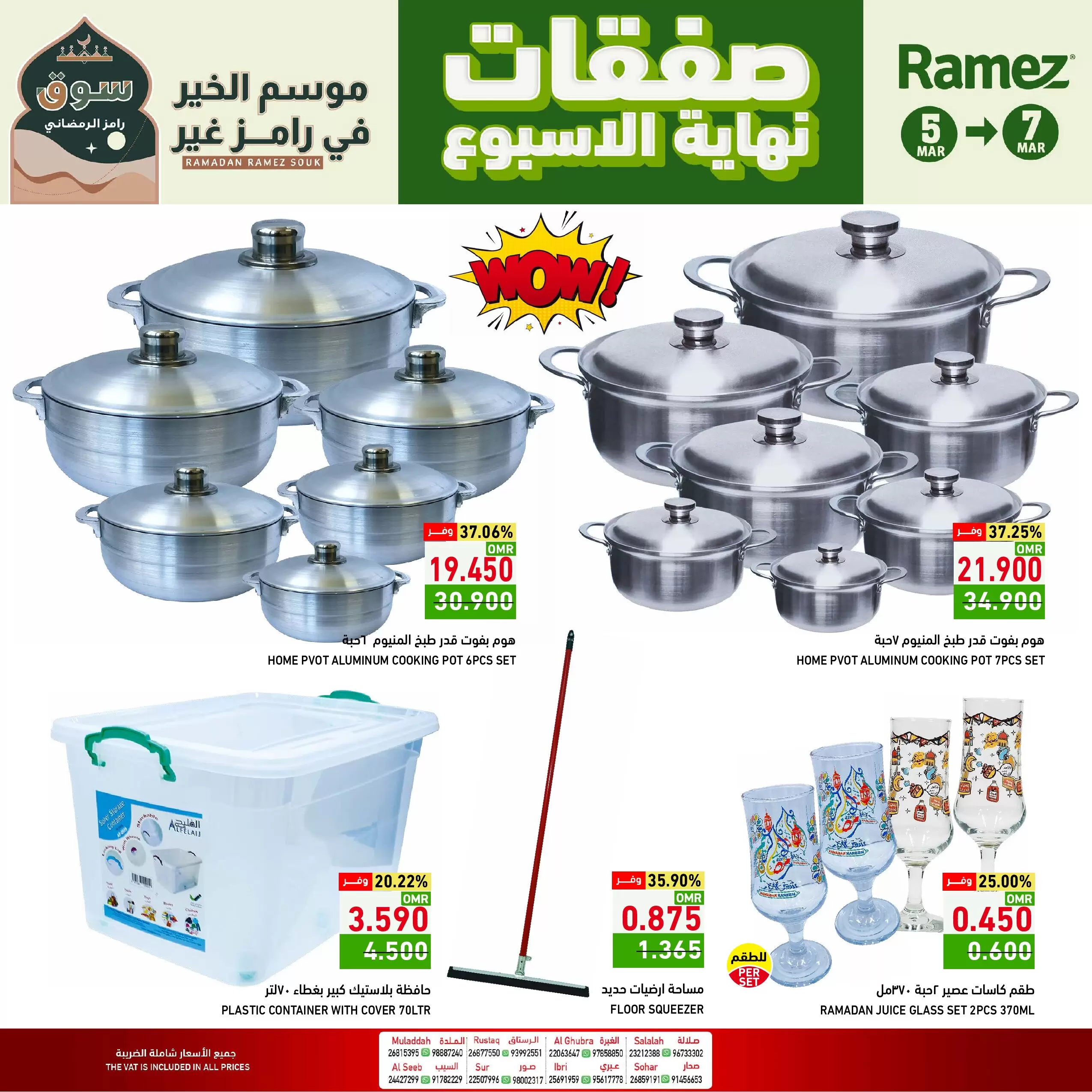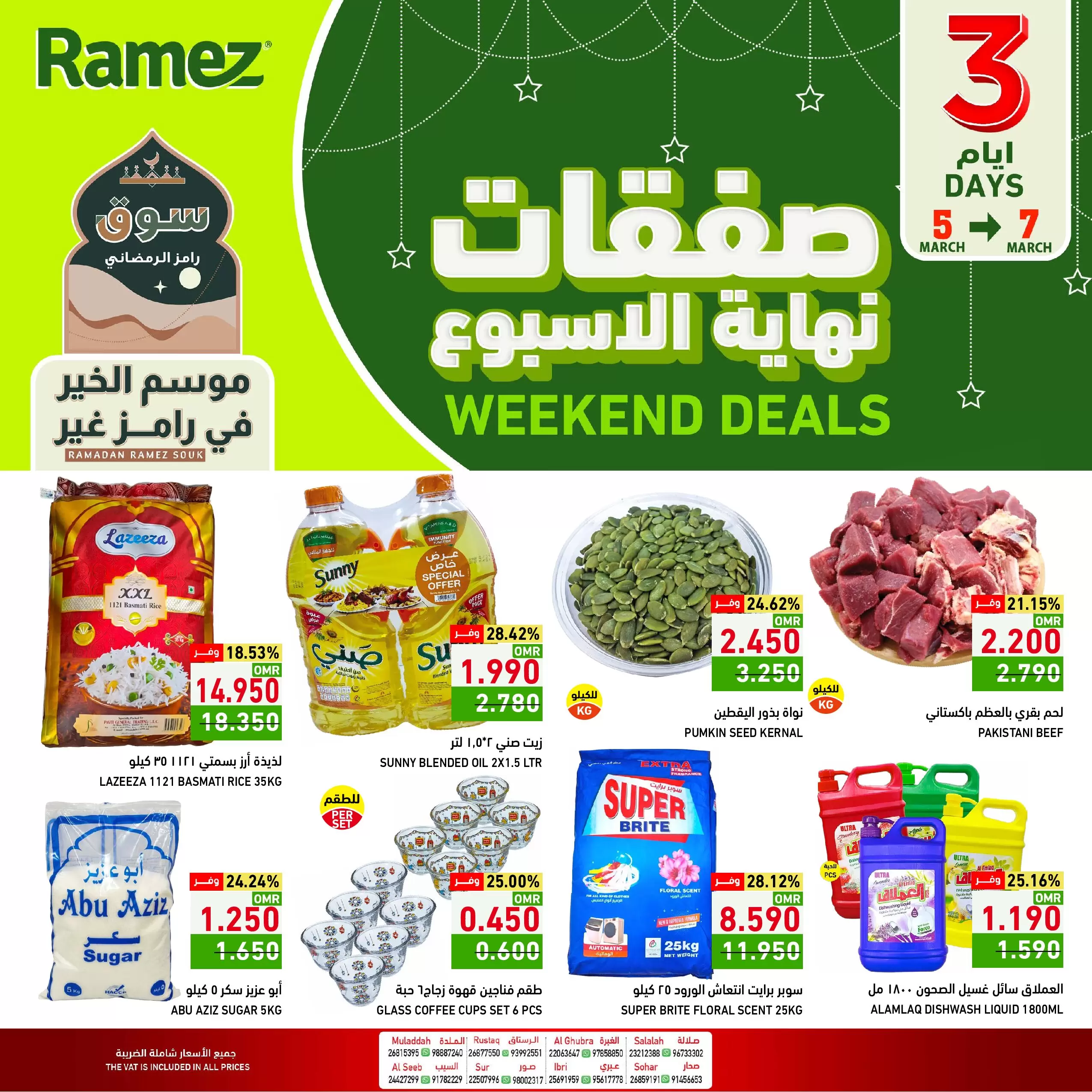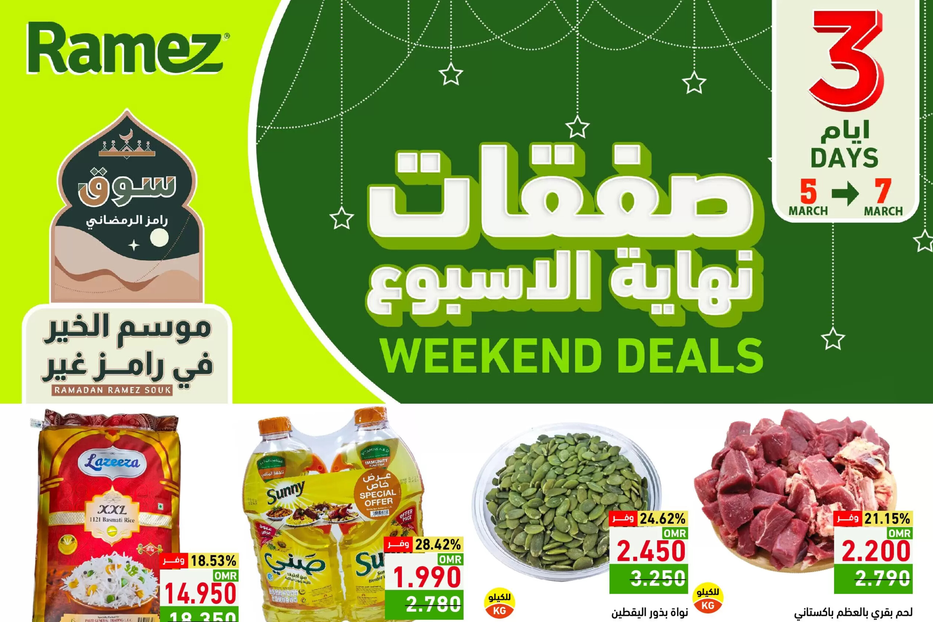 تستعد العائلات في سلطنة عمان لاستقبال شهر الخير والبركة، وفي هذا السياق، أطلقت أسواق رامز (Ramez) مجلة عروضها الجديدة تحت شعار "موسم الخير في رامز غير" و "صفقات نهاية الأسبوع" . تبدأ هذه العروض من 5 مارس وحتى 7 مارس 2026، وتشمل تخفيضات هائلة تصل إلى أكثر من 50% على المواد الغذائية، والمستلزمات المنزلية، وأدوات المطبخ.