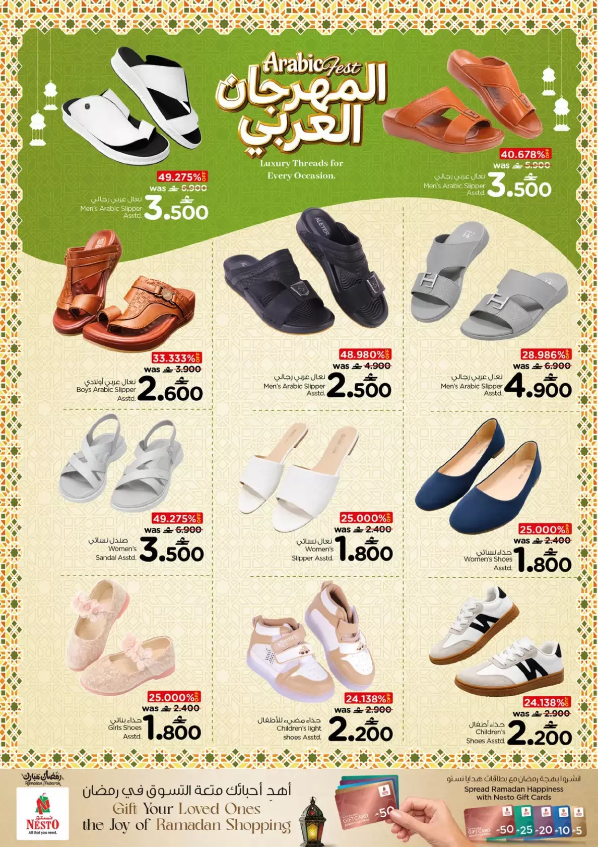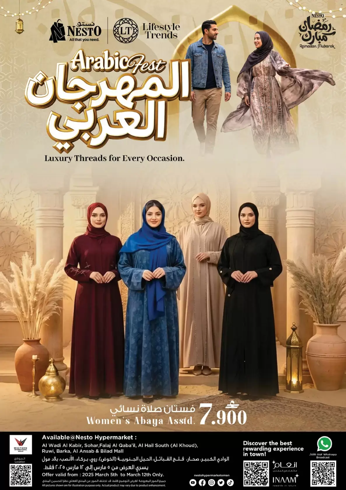 تستقبل سلطنة عمان شهر مارس بحدث تسوق استثنائي، حيث أعلنت نستو هايبر ماركت (Nesto Oman) عن إطلاق مجلة عروضها الجديدة تحت عنوان "المهرجان العربي" (Arabic Fest) . تبدأ هذه العروض من 5 مارس وحتى 12 مارس 2026، وتأتي تزامناً مع الاستعدادات لاستقبال شهر رمضان المبارك، موفرةً تشكيلة راقية من "الخيوط الفاخرة لكل مناسبة".