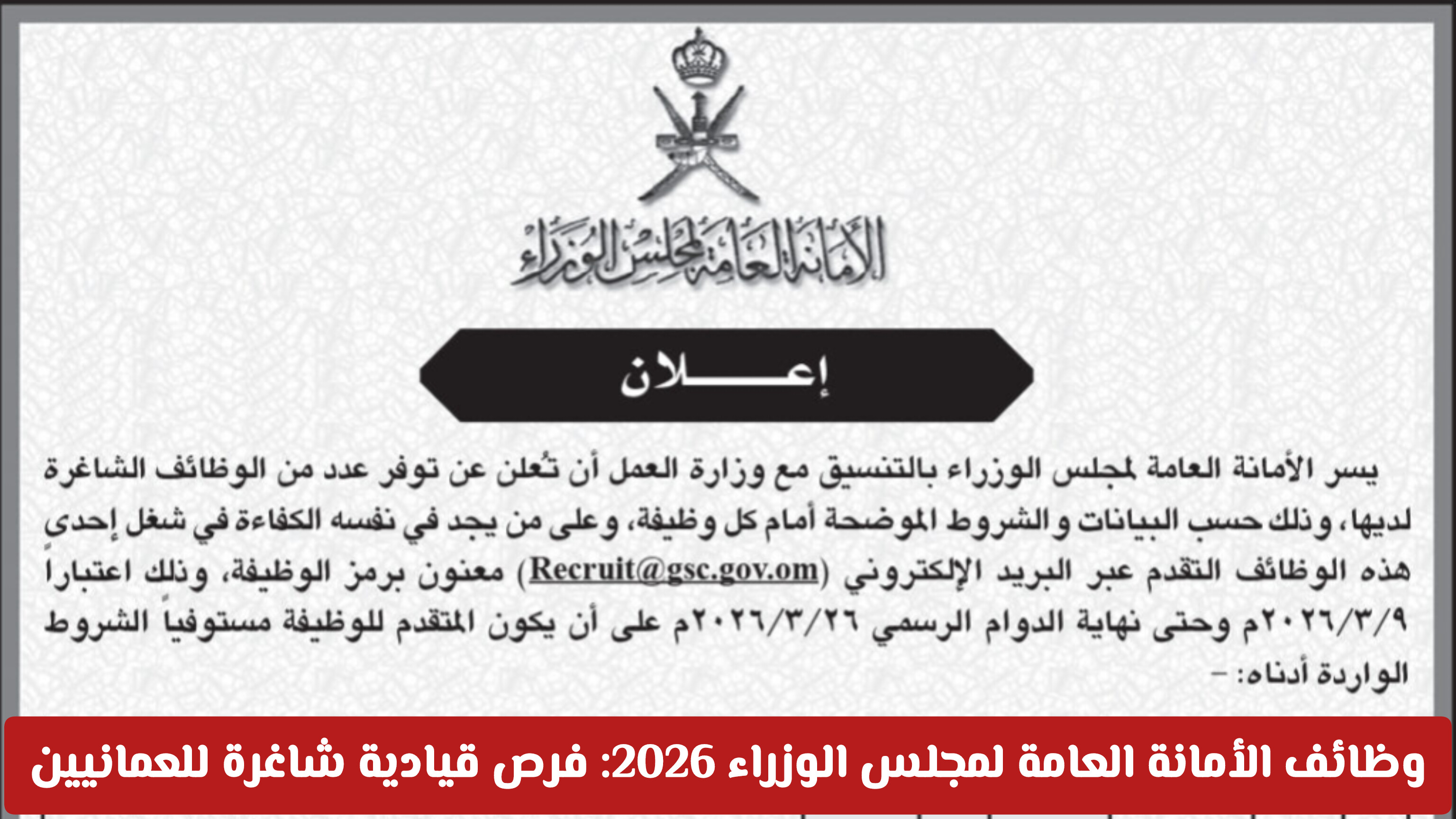 تعلن الأمانة العامة لمجلس الوزراء في سلطنة عمان، بالتعاون الوثيق مع وزارة العمل، عن فتح باب التوظيف للكوادر الوطنية الطموحة لشغل مجموعة من الفرص الوظيفية القيادية المرموقة . تهدف هذه المبادرة إلى تعزيز الجهاز الإداري للدولة بكفاءات عمانية قادرة على قيادة التحول وصنع القرار. يمكن للراغبين في التقديم إرسال طلباتهم عبر البريد الإلكتروني المخصص ([email protected]) مع ضرورة كتابة رمز الوظيفة في عنوان الرسالة، وذلك في الفترة الممتدة من 9 مارس 2026 وحتى نهاية الدوام الرسمي ليوم 26 مارس 2026، مع الالتزام بكافة الشروط المذكورة أدناه.